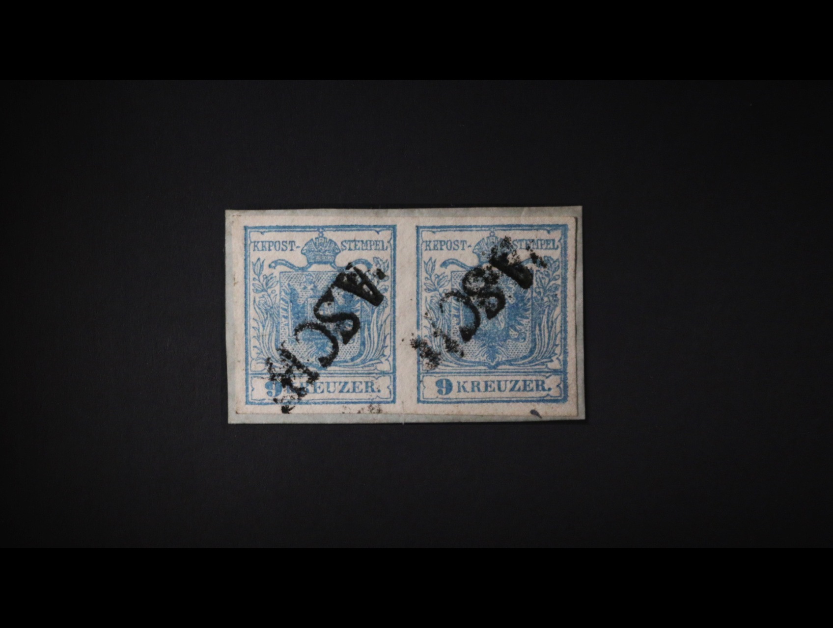 výstřižek frank. 2-páskou 9Kr I. typ HP, s předznámkovým raz. ASCH , kat. 210 EUR + 200 bodů v katalogu Müller; vzácné!
