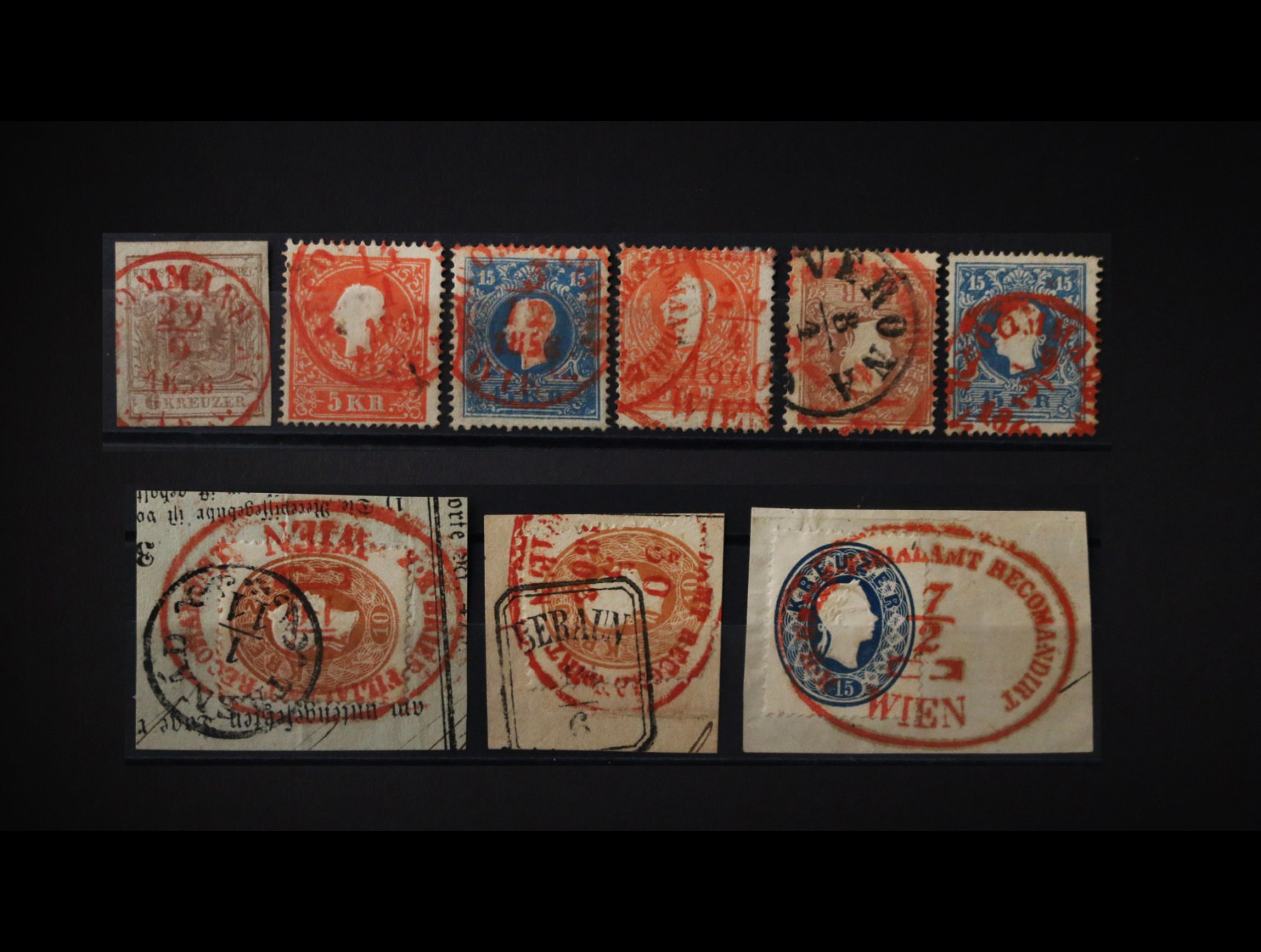 zn. 6Kr 1850, 5kr a 15kr I. typ a 5-15kr II. typ 1858; navíc 2 x 10kr a 15kr 1861 na výstřižcích, vše s červenými razítky, velmi pěkná sestava, kat. min. 580 EUR