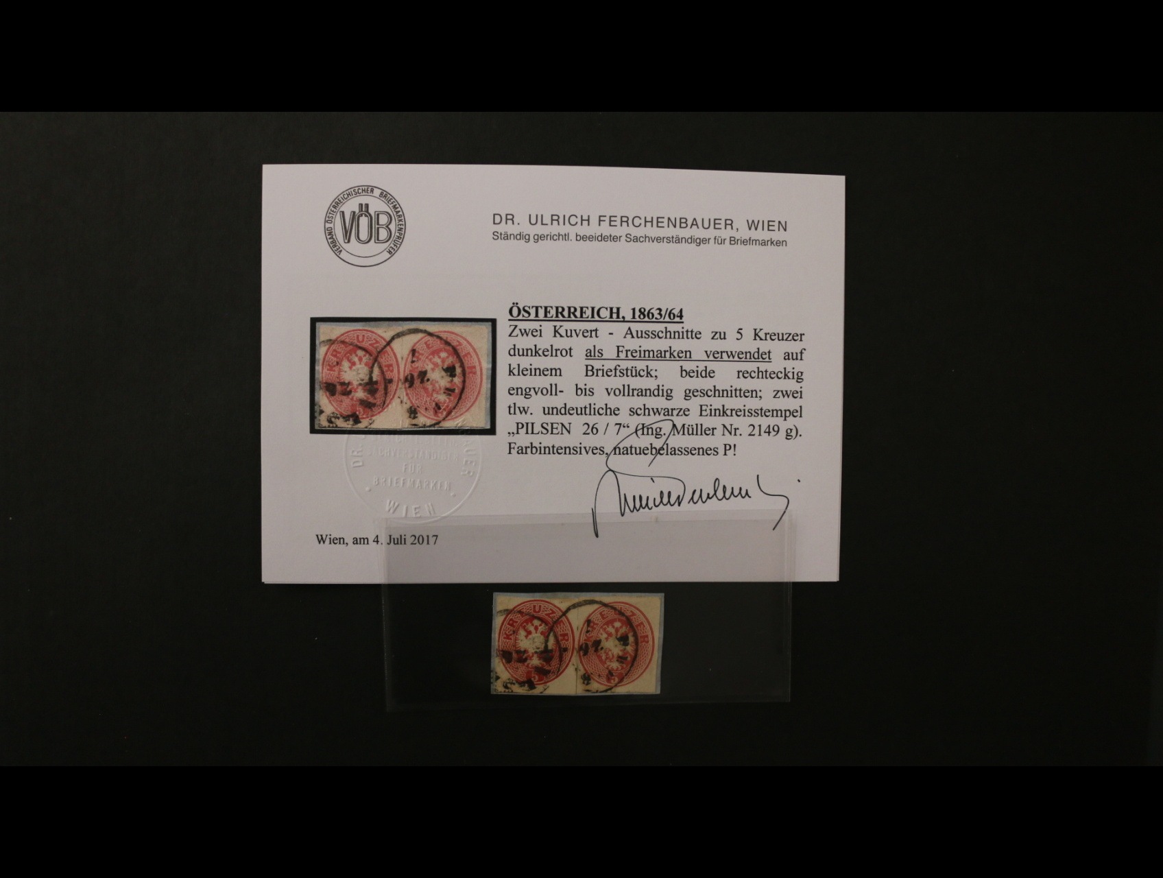 dvě vystřižené zn. z celin. obálek 5kr, vydání 1863/4 na malém výstřižku s jednokruh. raz. PILSEN 26.7., velmi vzácné, atest Ferchenbauer