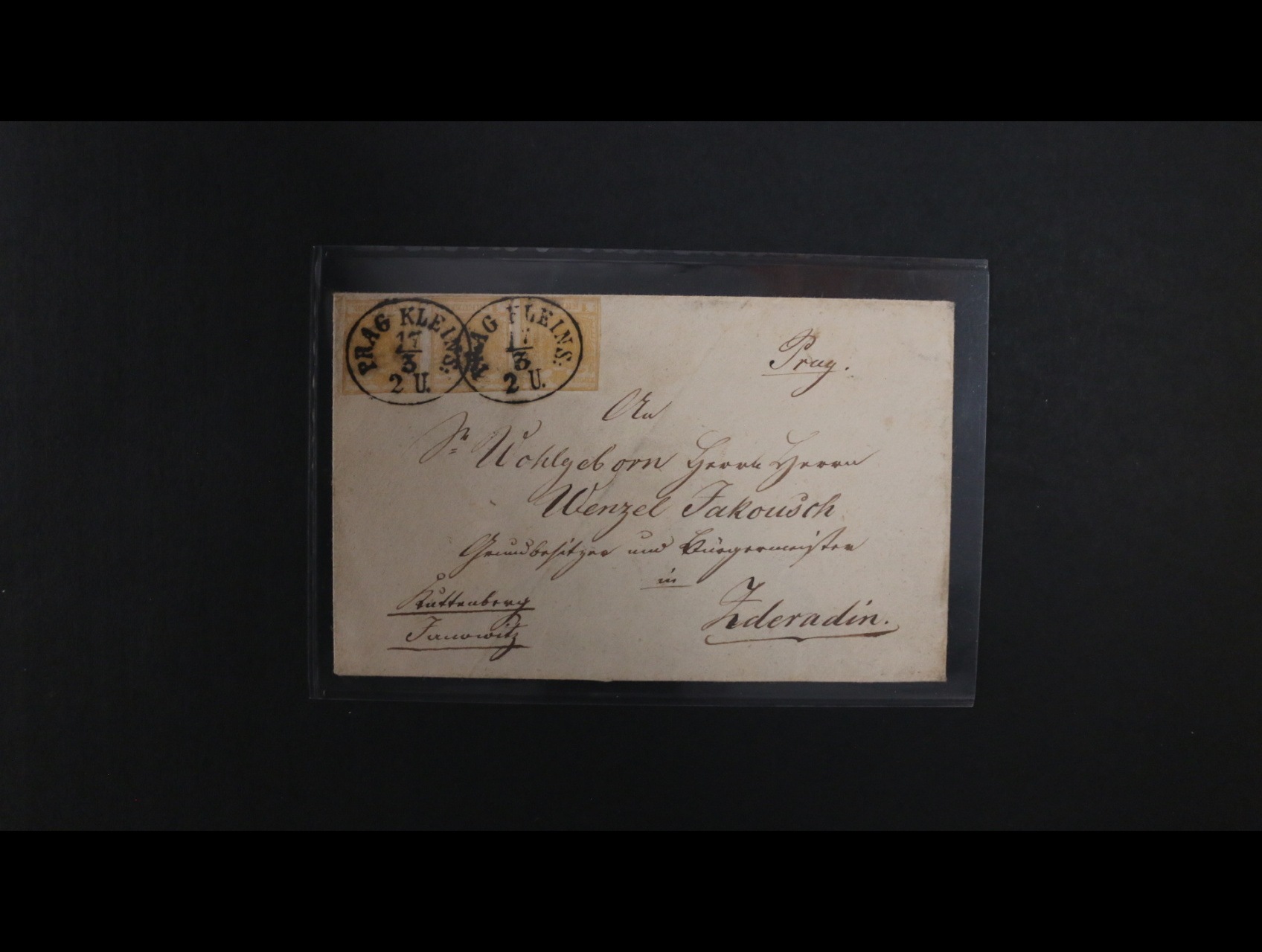 obálka frank. vodorovnou třípáskou zn. Fe. č. 1, typ III, oválné pod. raz. PRAG KLEINS: 17.3., na zadní str.chybí chlopeň, přích. raz., cca 2300 EUR