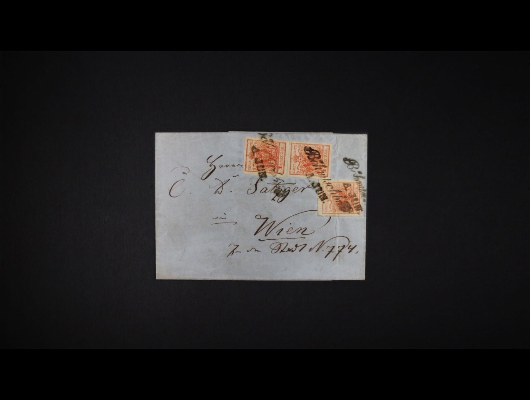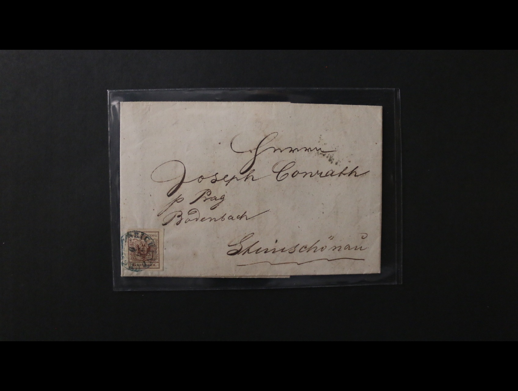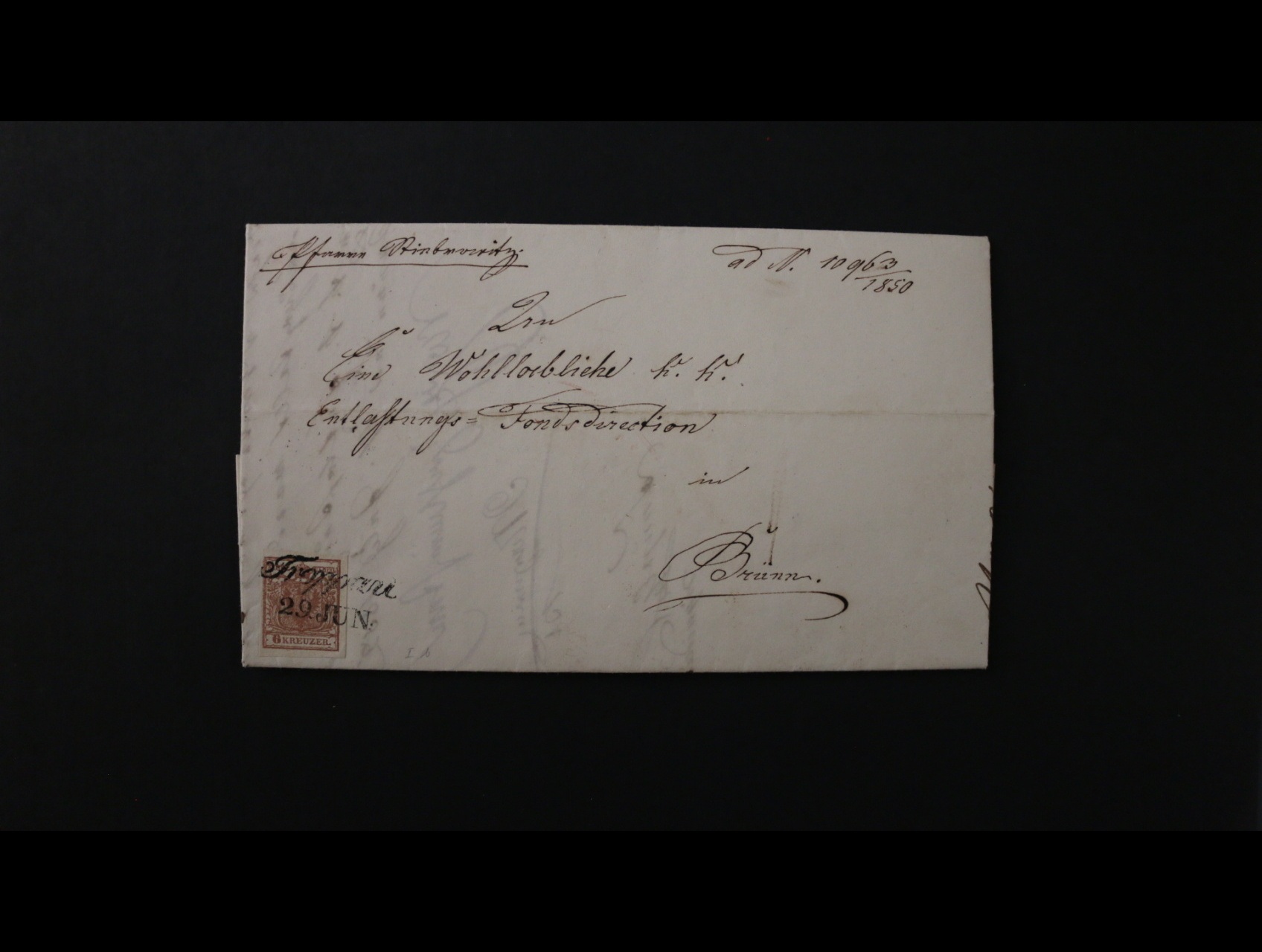 skl. dopis z r. 1851 frank. zn. Fe. č. 3, typ I, vypodložený střed, pod. raz. IGLAU 14.5., lehký registr. lom v horní části, cca 200 EUR
