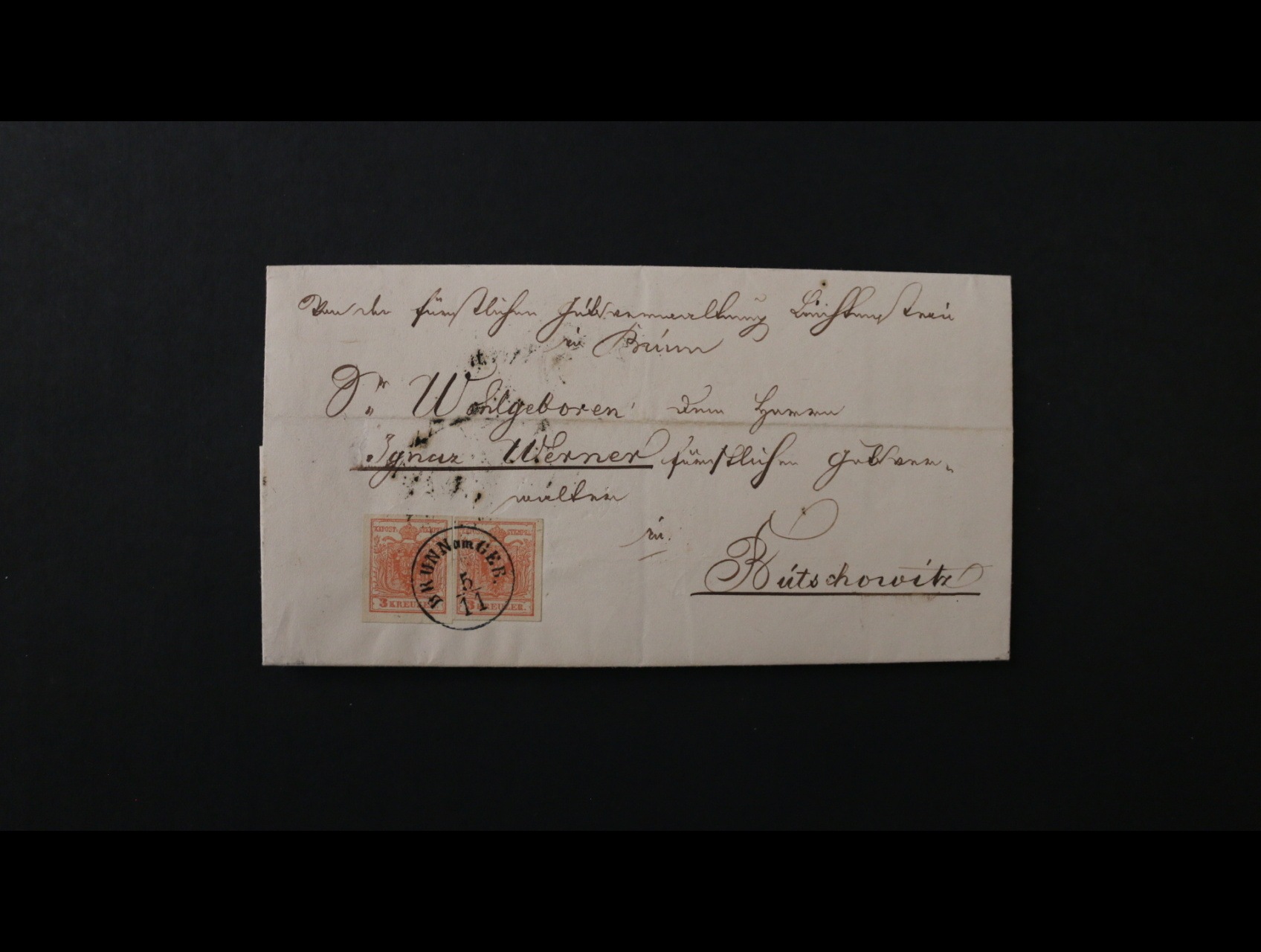 skl. dopis do Bučovic z r. 1855 frank. zn. Fe. č. 3, typ IIIb (2x), jednokruh. pod. raz. BRUNN AM GEB. 5.11., průch. a přích. raz., lux. kvalita