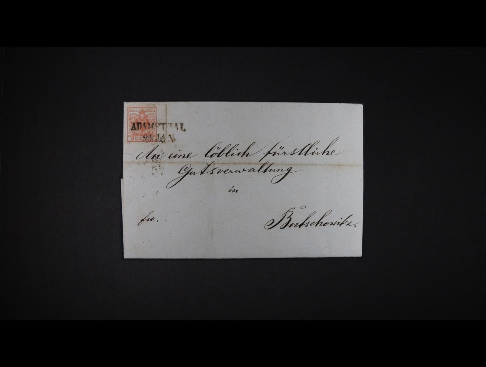 skl. dopis do Bučovic z r. 1857 frank. zn. Fe. č. 3b s pravým okrajem 6 mm, pod. řádkové raz. ADAMSTAHL, průch. a přích. raz.