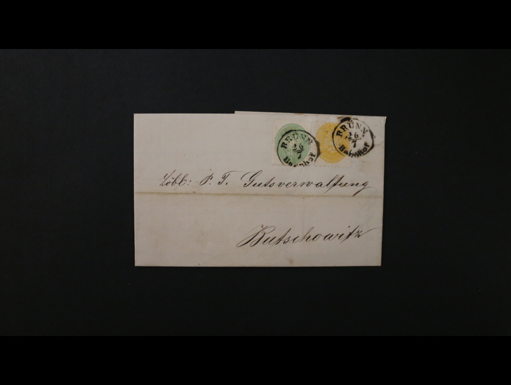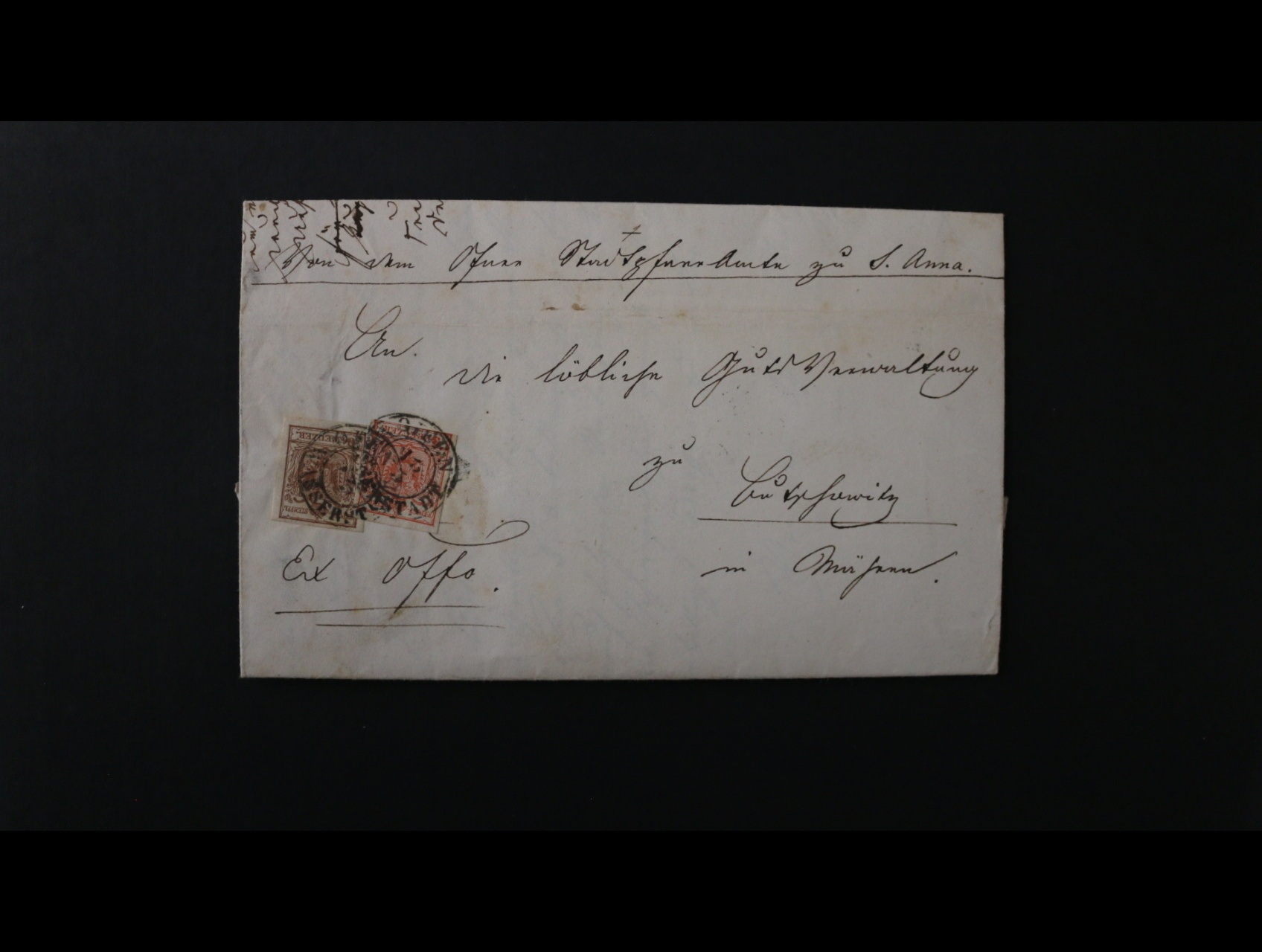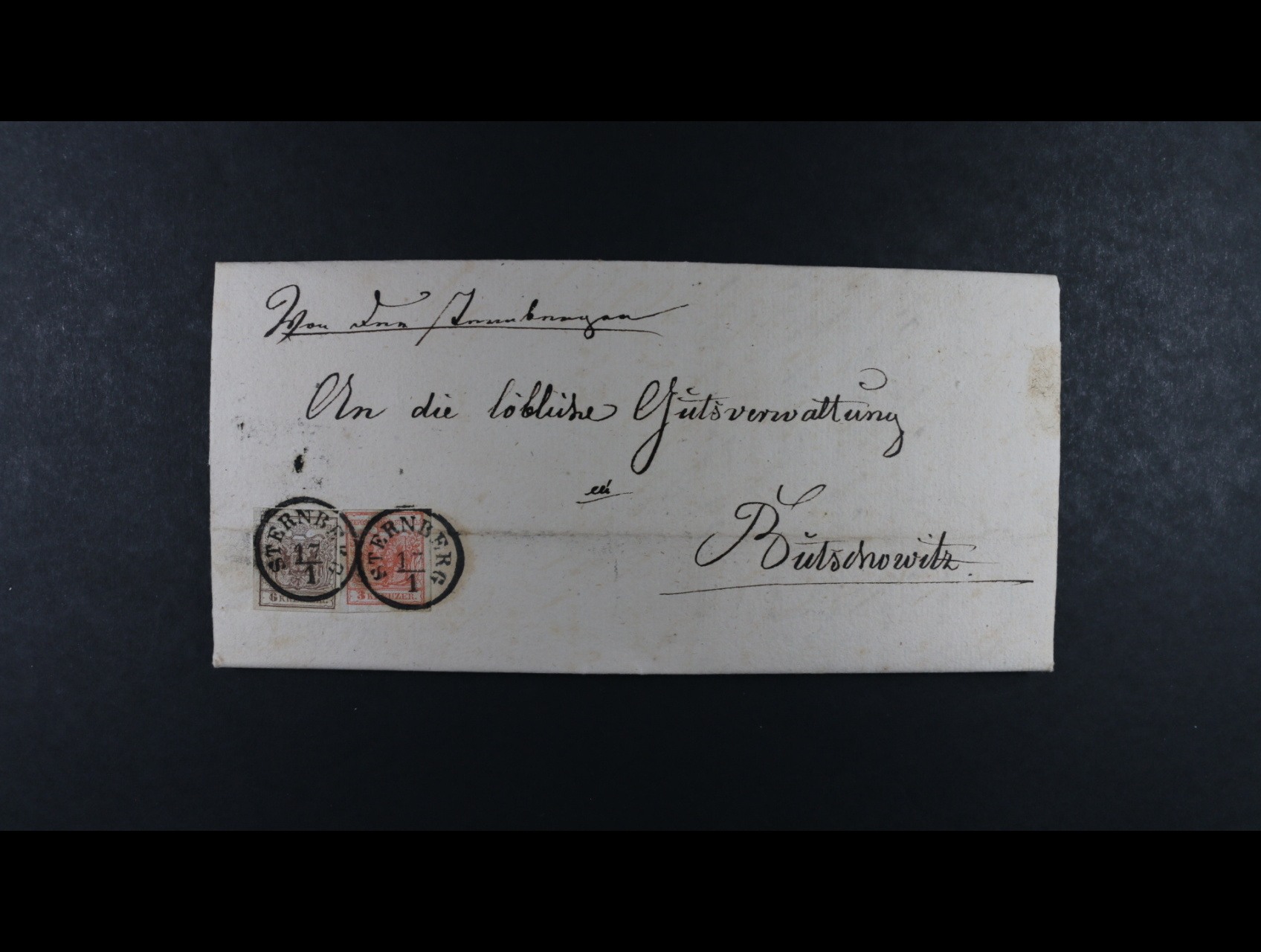skl. dopis do Bučovic z r. 1854 frank. zn. Fe. č. 3 + 4, pod. raz. STERNBERG 17.1., průch. a přích. raz., ve spodní části registr. lom