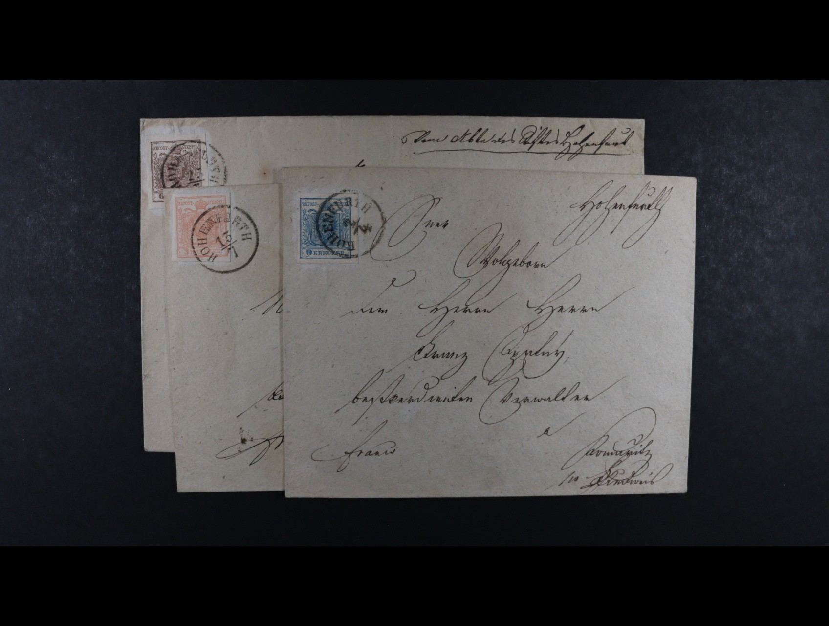 sestava 3 ks dopisů (obálek) frank. zn. Fe. č. 3, 4, 5, všecny typ III, raz. HOHENFURTH 15.7., 2.4. a 23.3., původní neporušené početě, přích raz.
