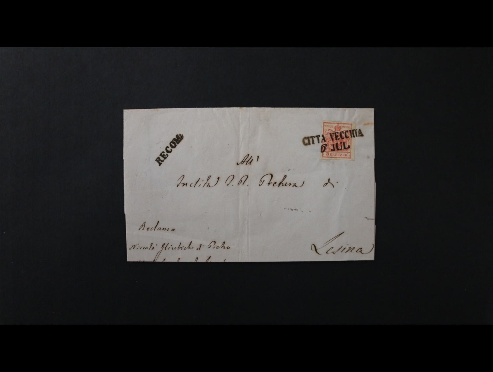 skl. R-dopis do Lesina frank. na přední str. zn. Fe. č. 3, na zadní str. zn. Fe. č. 4, pod. řádkové raz. CITTA VECCHIA 6.JUL.