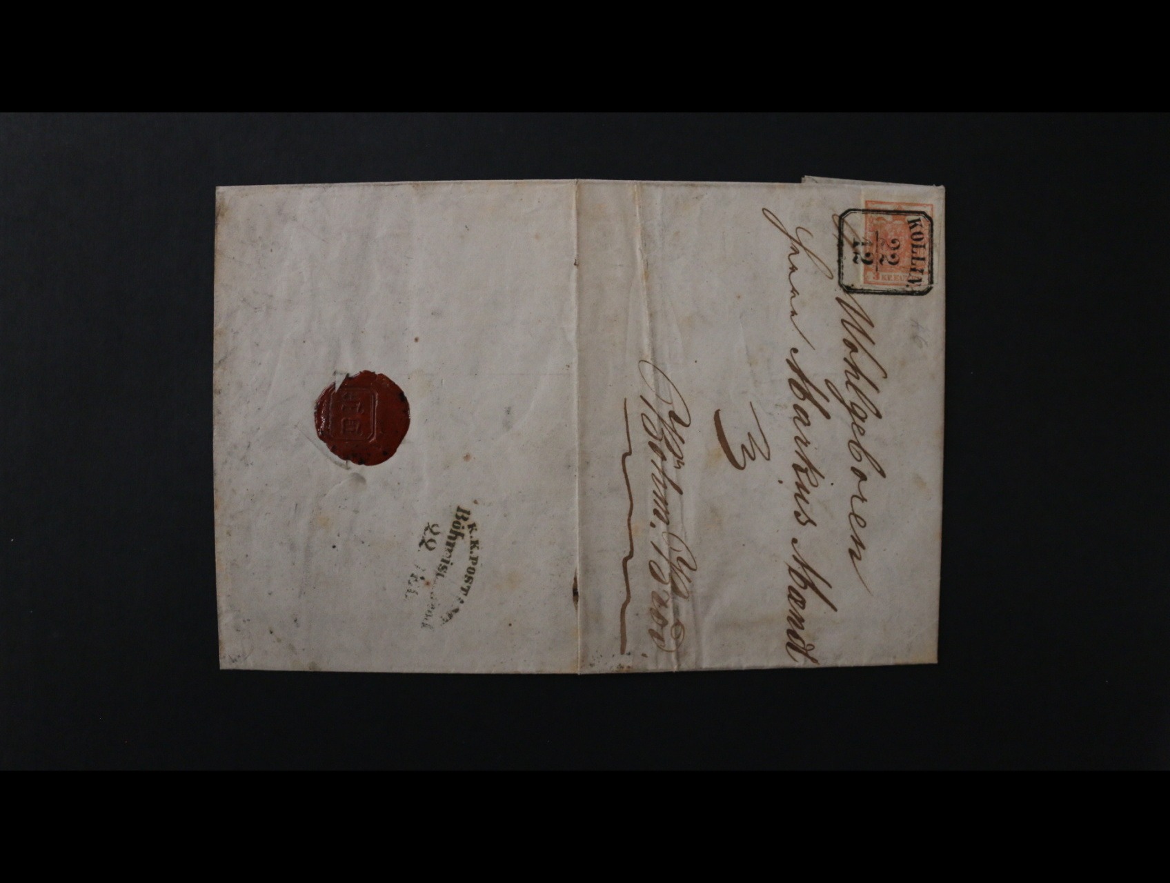 skl. dopis do Českého Brodu z r. 1852 frank. zn. Fe. č. 3, pod. rámečkové raz. KOLLIN 22.12., přích. raz. K.K. POSTAMT Böhmische Brod