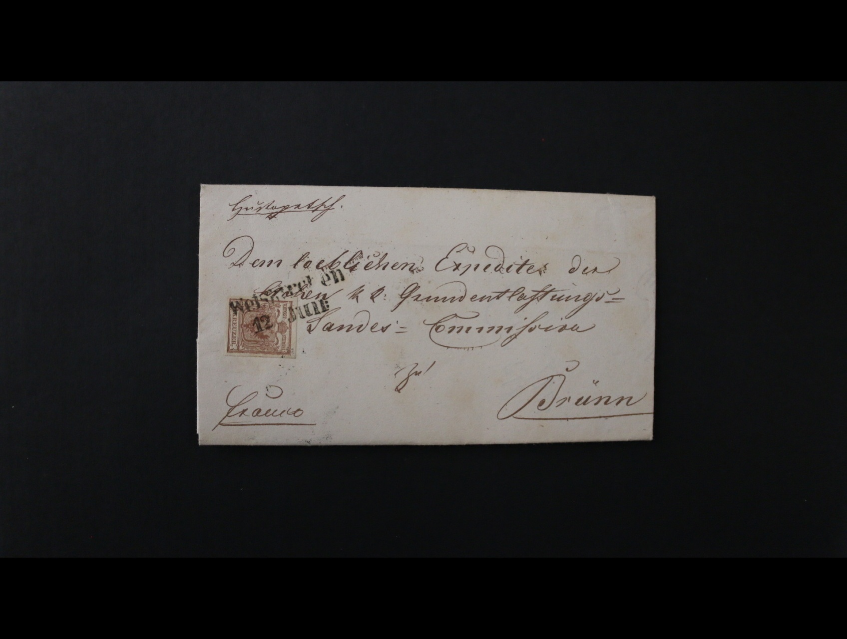 skl. dopis do Brna z r. 1852 frank. zn. Fe. č. 4 HP, typ Ib, rostbraun, pod. řádkové raz. WEISKIRCHEN 12.JUN., přích. raz., lux. kvalita