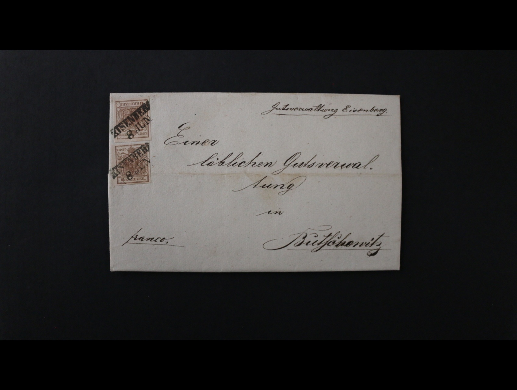 skl. dopis do Bučovic z r. 1858 frank. zn. Fe. č. 4, typ III, (2x), na spodní zn. DV otevřená šestka ve spodní části, pod. raz. EISENBERG 8.JUN, přích. raz., uprostřed dopisu vodorovný lom