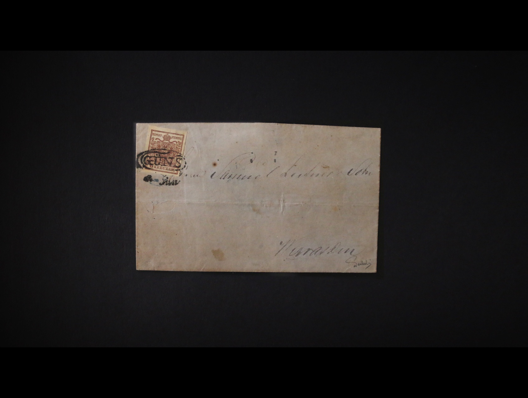 skl. dopis z r.1850 frank. zn. Fe. č. 4, 6kr I. typ, pod. raz. GUNS 5. JUN (příchozí VARASDIN 4.6.1850, podací tedy možná 3.6.1850!), velmi zajímavý dopis ex. Dr. JERGER, atest Ferch. „PRACHTSTUCK“, kat. pro 3.6. 3500 EUR , pro 5.6. – 2000 EUR