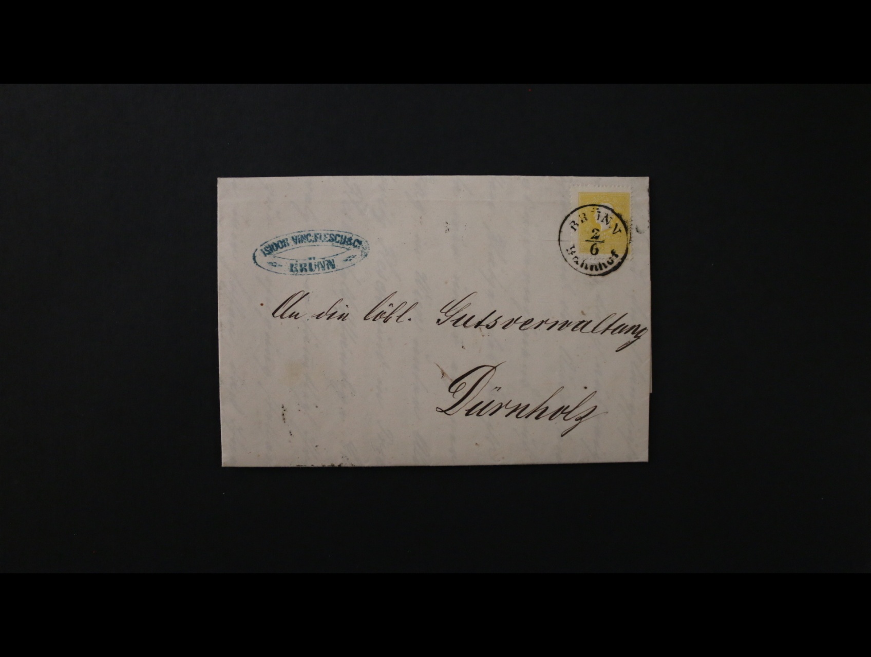 firemní skl. dopis do Drnoholce z r. 1861 frank. zn. Fe. č. 10 II, pod. raz. BRÜNN BAHNHOF 2.6., průch. a přích. raz., lux. kvalita