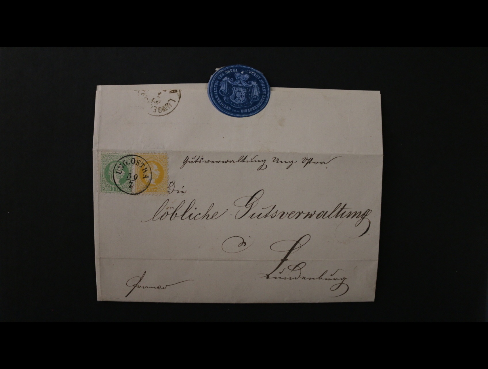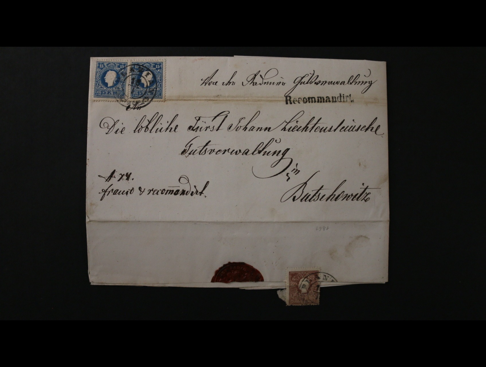 skl. dopis do Břeclavi z r. 1868 frank. zn. Fe. č. 35 I + 36 I, pod. raz. UNG. OSTRÁ 30.7., přích. raz., zálepka FÜRST JOHANN LIECHTENSTEIN ..., velmi dobrá kvalita