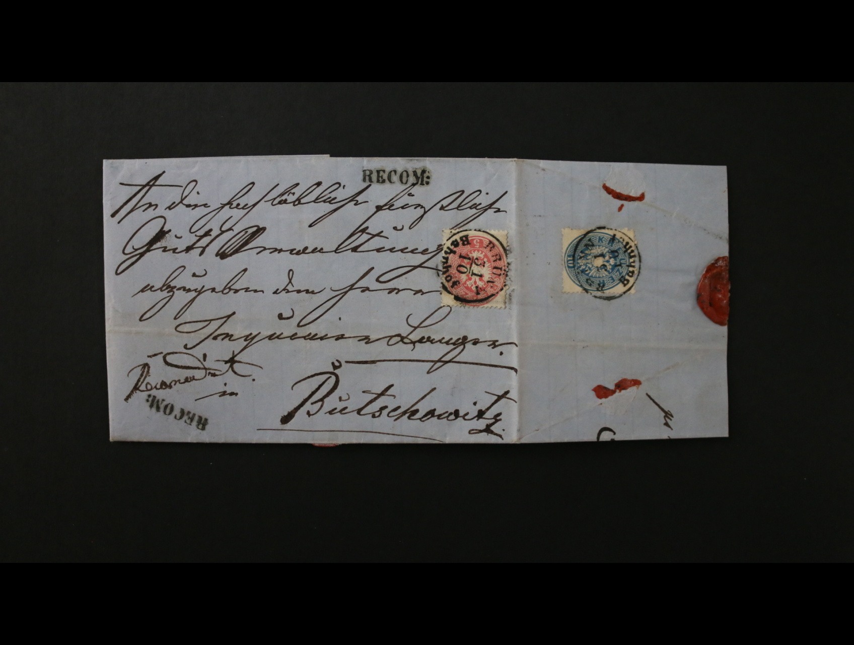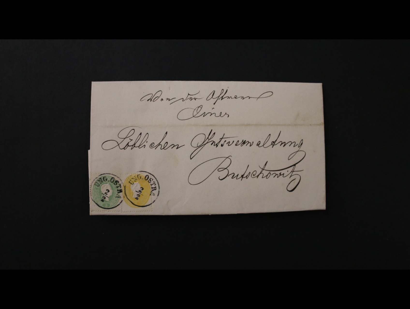 skl. dopis do Bučovic z r. 1863 frank. zn. Fe. č. 18 + 19, pod. jednokruh. raz. UNG. OSTRA, velmi dobrá kvalita, cca 340 EUR