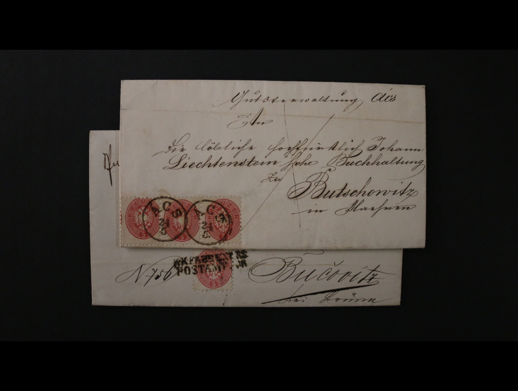 skl. dopis do Bučovic z r. 1866 frank. zn. Fe. č. 32 s řádkovým raz. K.K. FAHRENDESPOSTAMT a skl. dopis z r. 1865 frank. zn. Fe. č. 32 (3x) s posunutou perforací vlevo, pod. raz. ÁCS 24.5.