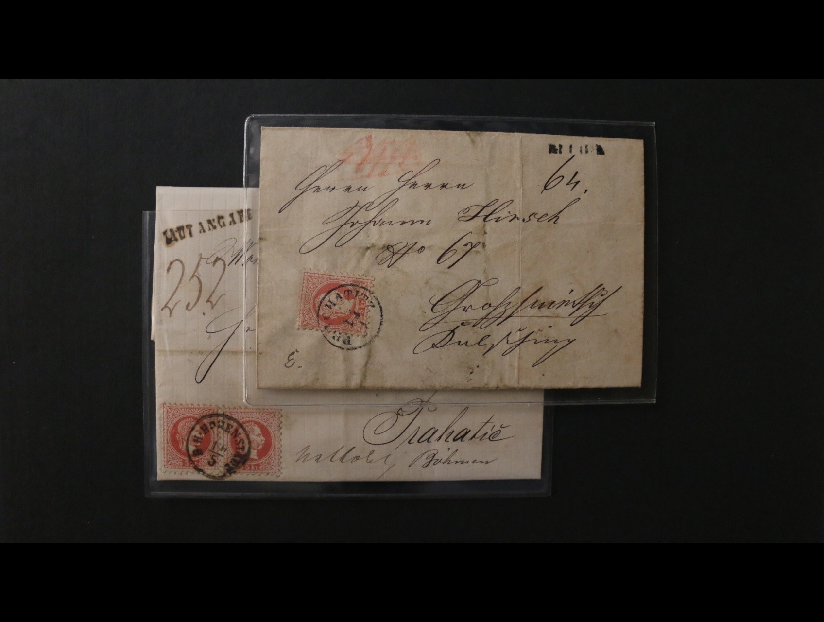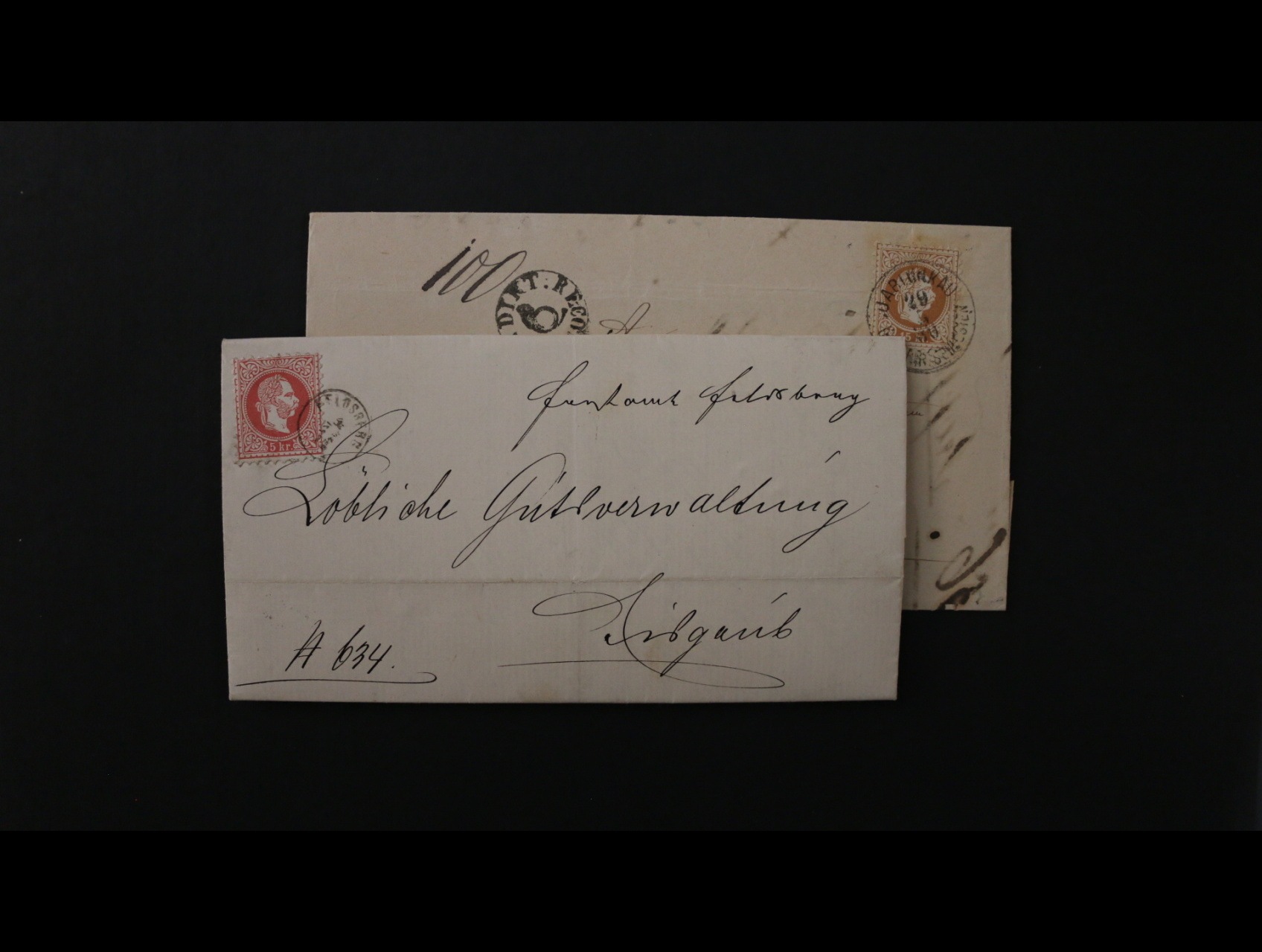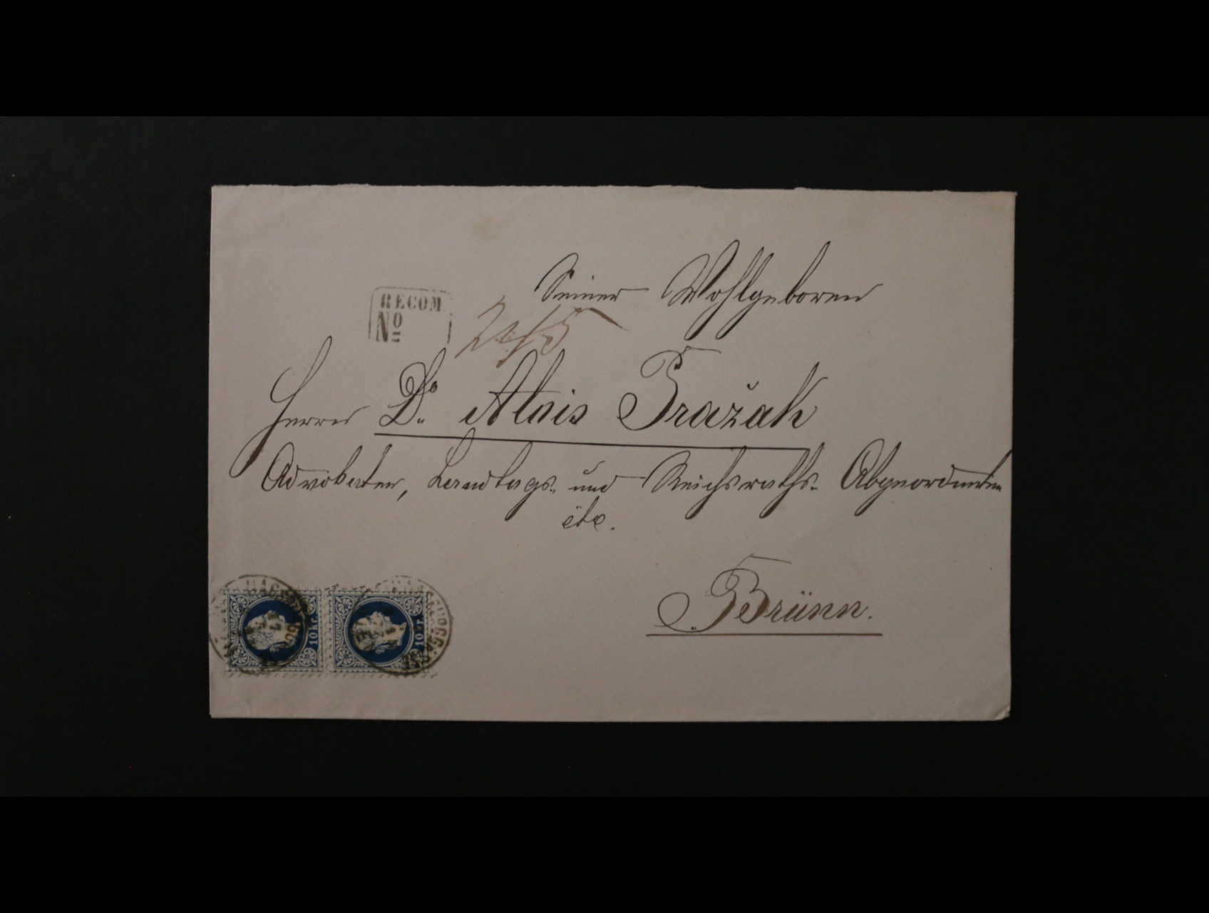 skl. dopis do Lednice z r. 1871 frank. zn. Fe. č. 37 I s náprstkovým raz. FELDSBERG, průch. raz. LUNDENBURG a modré přích. raz. EISGRUB a skl. R-dopis z r. 1880 frank. zn. Fe. č. 39 II, pod. raz. JABLUNKAU 29.5.80 + kulaté přídavné raz. RECOMMANDIRT s pošt. trubkou, přích. raz., v horní části i přes zn. slabý registr. lom, přesto velmi zajímavé a vzácné