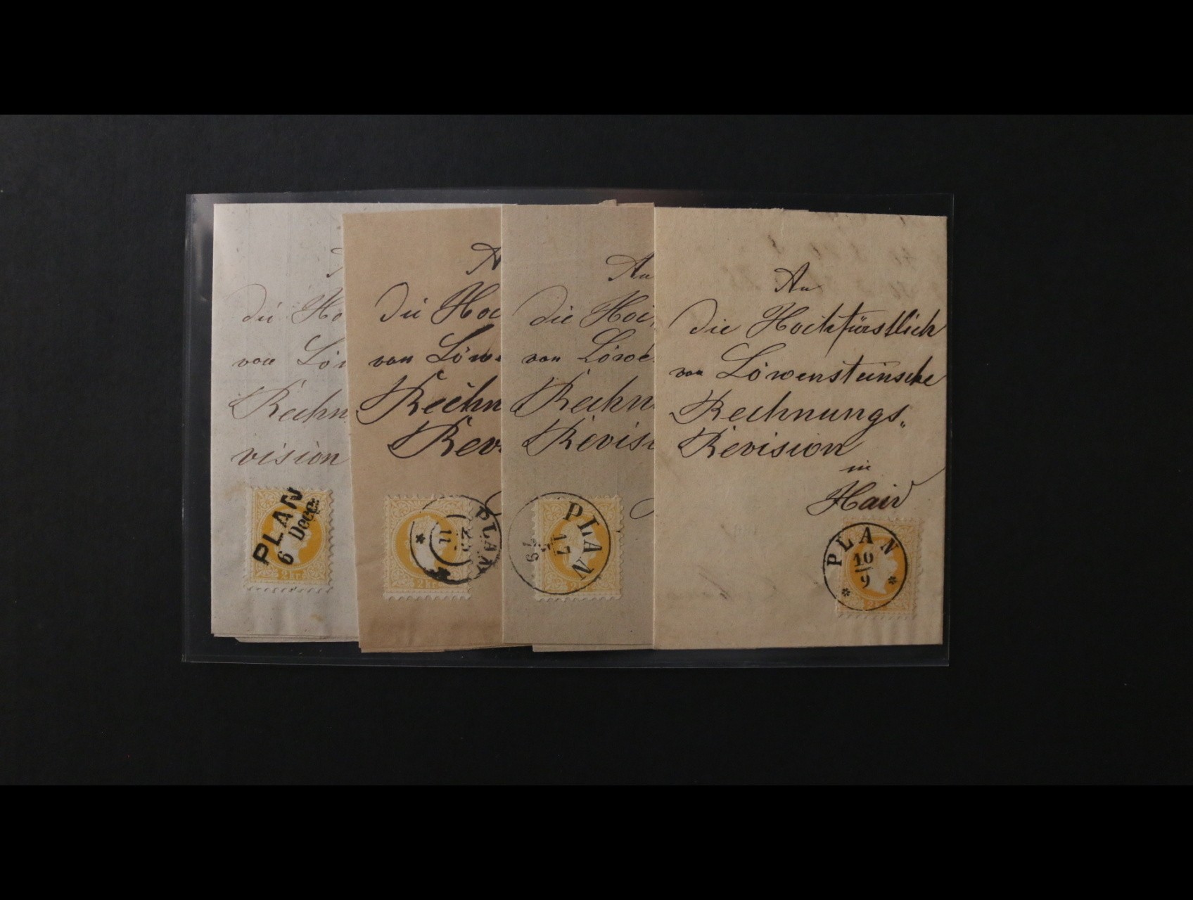 4 tiskopisy malého formátu frank. známkami 2kr hrubý i jemný tisk, s různými razítky PLAN, atraktivní sestava