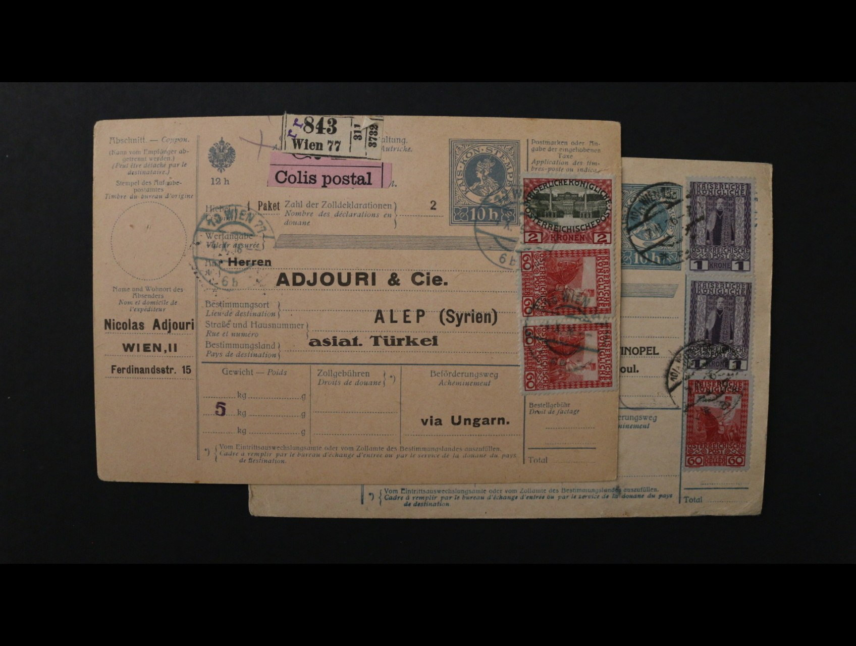 dvě kompl. pošt. průvodky z Vídně do Alepa, resp. Istambulu frank. zn. Mi. č. 151 ve vodorovné dvoupásce, 154, resp. 151 + 153 (2x), zajímavé