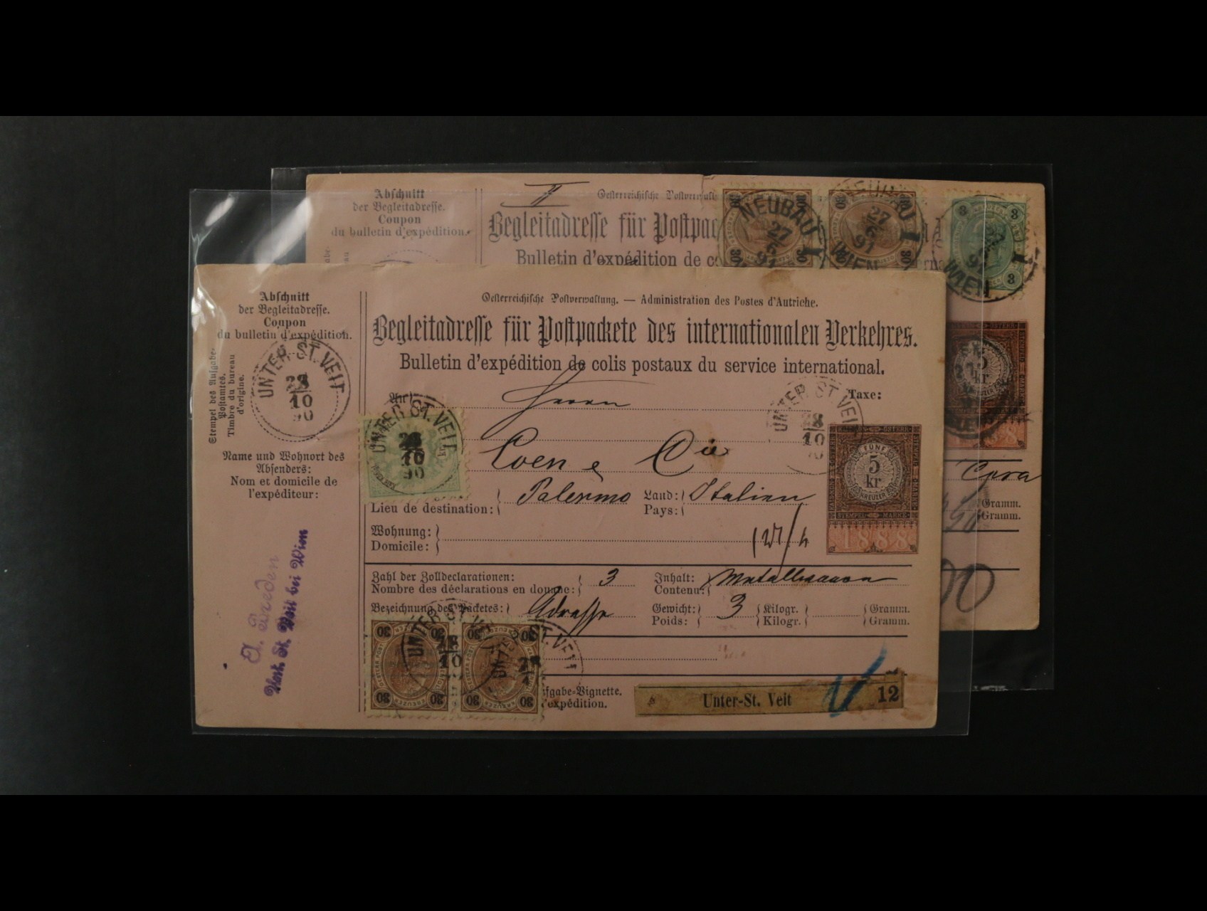 2 celé balíkové průvodky do Palerma, z UNTER ST: VEIT se smíšenou frankaturou 30+30kr 1890 + 3kr 1883 (!) a z NEUBAU / WIEn s 30+30+3kr