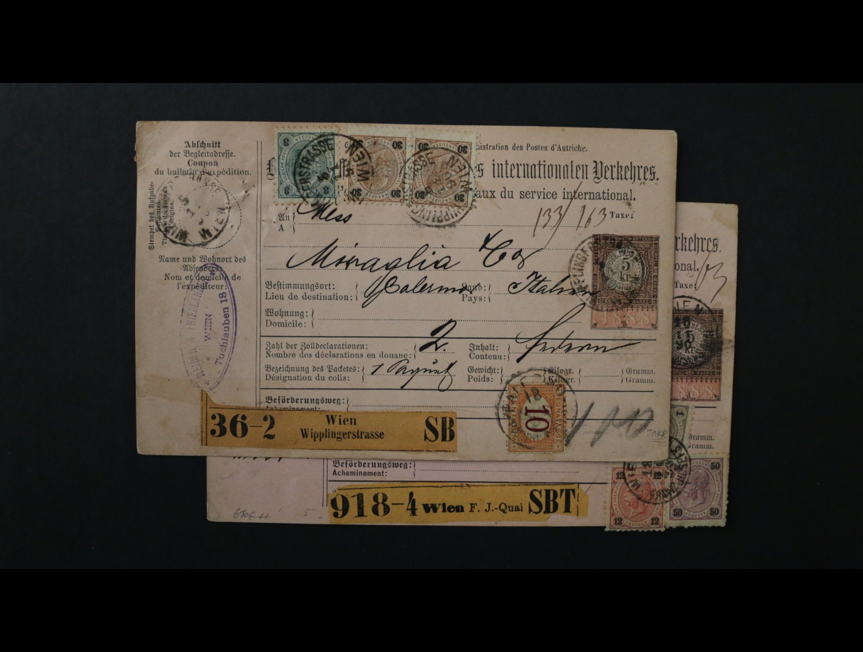 2 celé balíkové průvodky do Palerma, raz. WIPPLINGERSTRASSE s 30+30+3kr + italská doplatní 10Cts, a raz. WIEN FJ QUAI s 1+12+50kr, ojedinělý výskyt