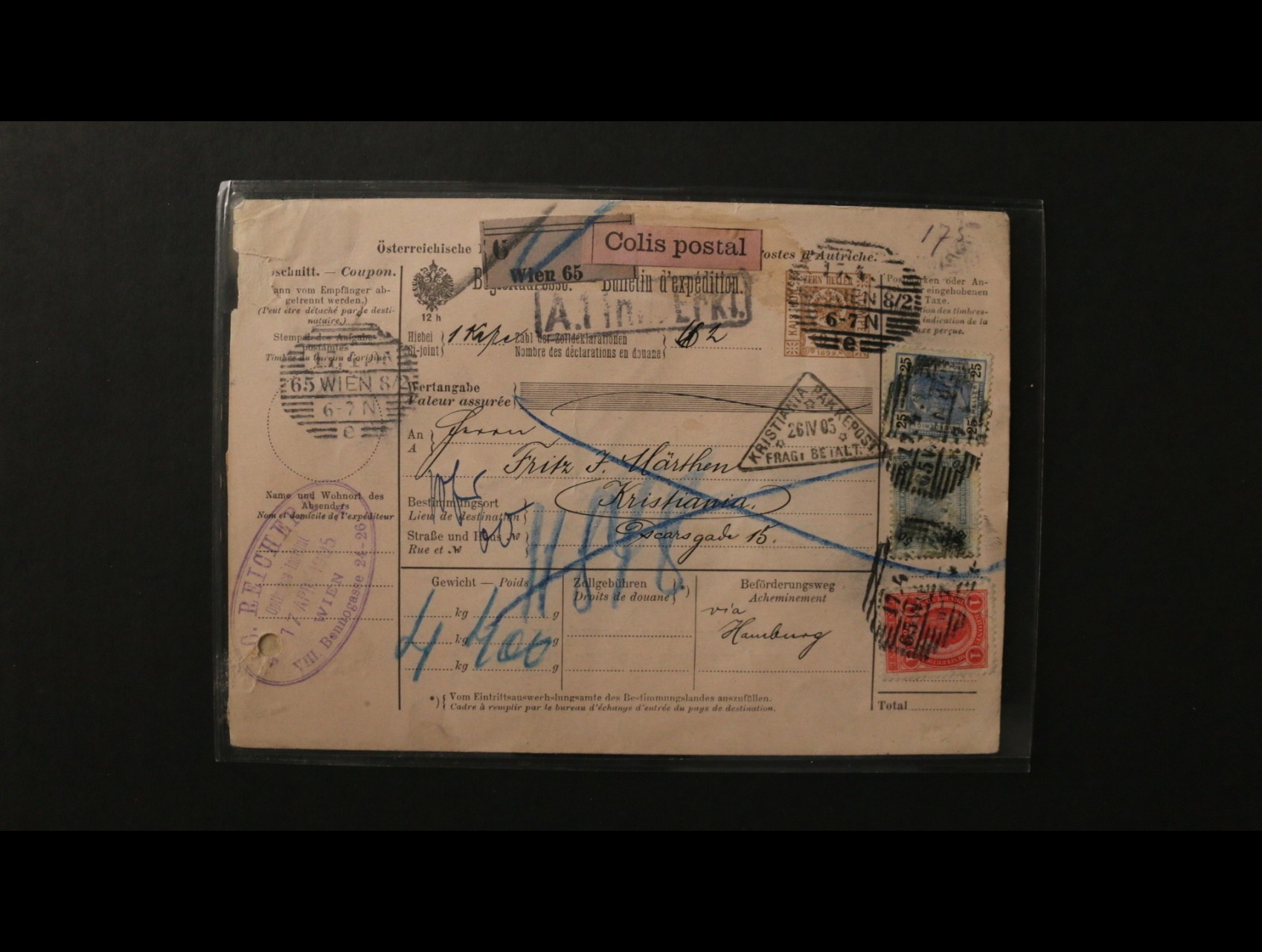 kompl. pošt. průvodka frank. vysokou pestrou frankaturou, pod. raz. WIEN, průch. raz. HAMBURG, přích. raz. KRISTIANIA 1905, na levém okraji registr. otvory + nekompl. průvodka do Basileje, pod. raz. RAUDNITZ 11.12.07, celní raz. a nálepky