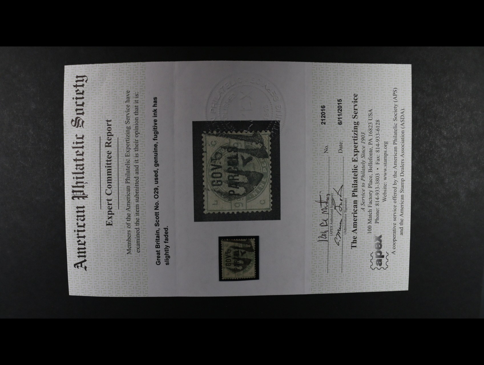 SG.O63, GOVT. PARCELS 9P zelená, atest American Phil. Society, vzácné, kat. 1200 GBP