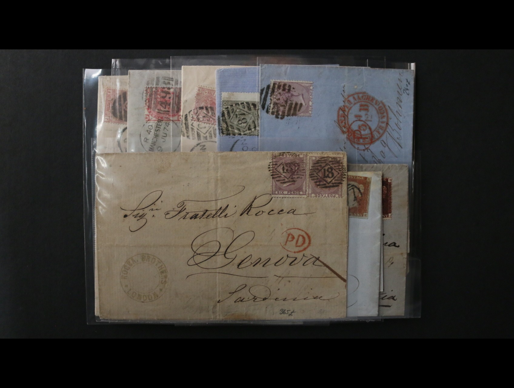 12 dopisů se známkami VIKTORIE. Od r. 1841, lepší frankatury, zasláno do Itálie, Německa, Ruska, Rakouska (Čechy, Dalmácie) , mj. 6P 1855, 2x6P 1855, 6P 1872, 2 x 41 P 1887; hodnotná sestava , kat. 1950 GBP