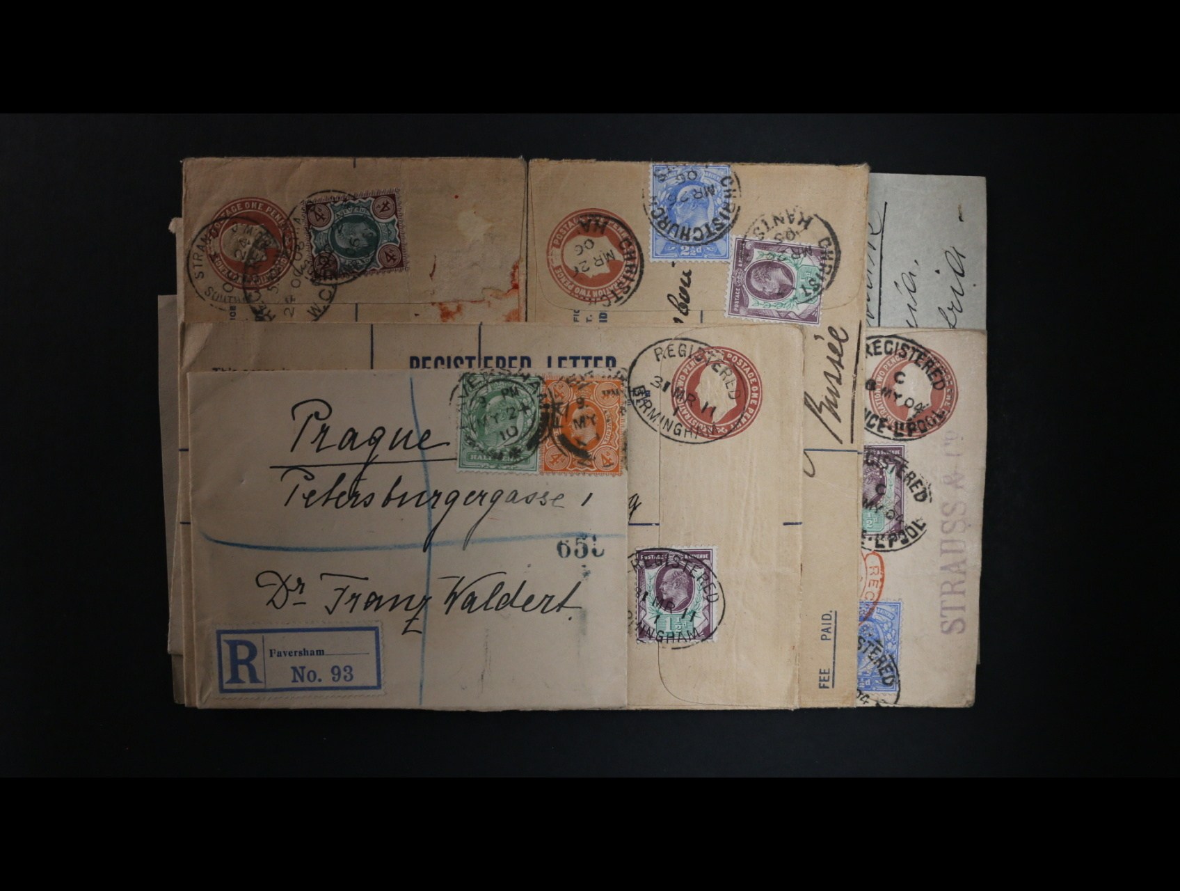 12 dopisů s frankaturami Edward VII. a Jiří V. Reko, dofrank. celiny, letcký dopis, lepší destinace – Bosna, smíšené frankatury, perfiny apod.