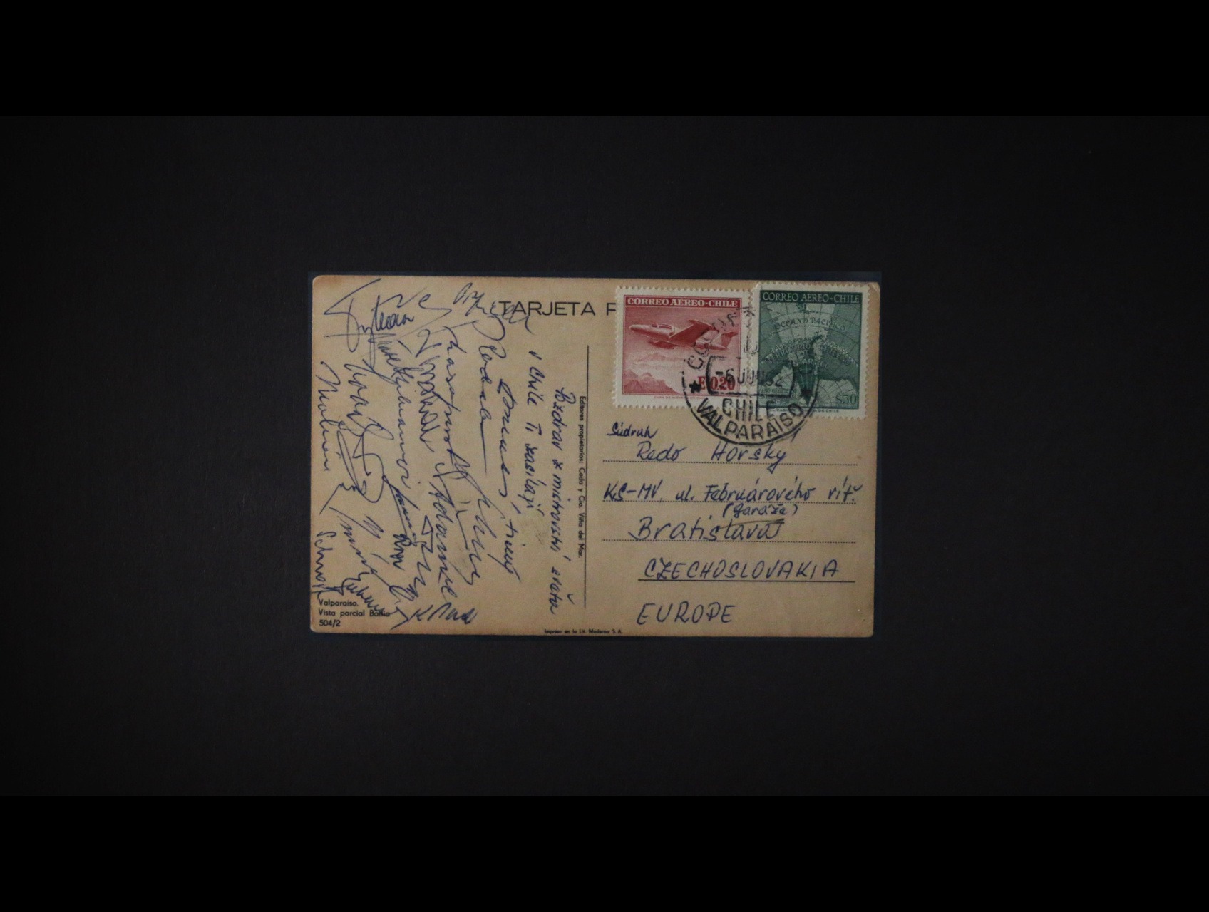 Sport - bar. pohlednice z MS ve fotbale Chile 1962 s podpisy hráčů nár. mužstva, např.: Masopust, Adamec, Popluhár, Mašek ..., zajímavé, velmi dobrá kvalita