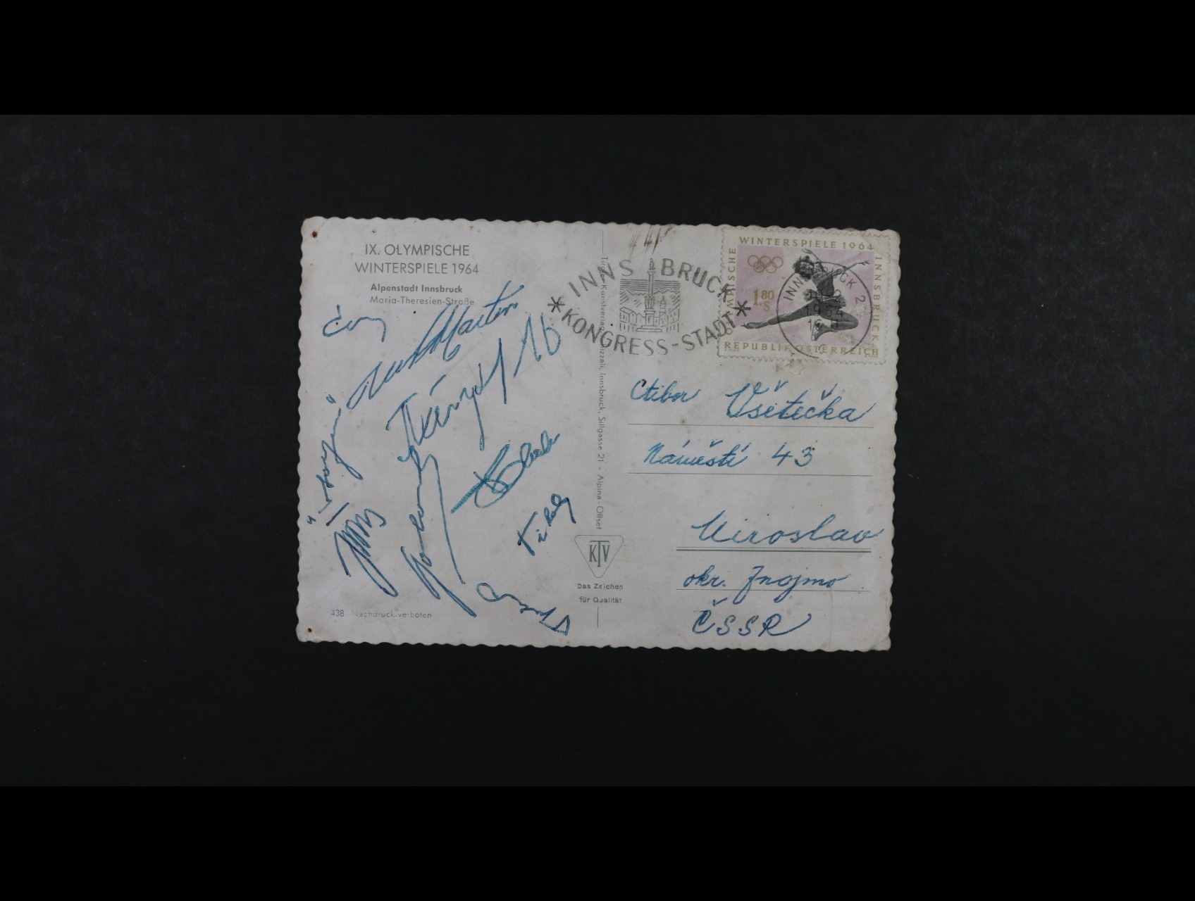 Sport - bar. pohlednice z OH INSBRUCK 1964 s podpisy hokejistů - Černý, Jiřík, Golonka, Tikal, Potsch, Bubník, Tregubov (SSSR), Martin (Kanada), Stolz (Švédsko)