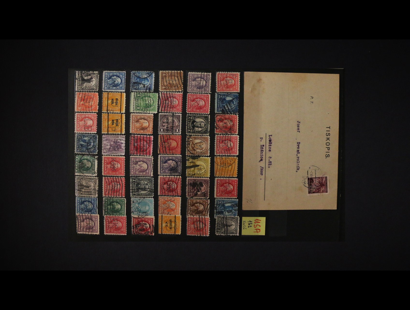USA - sestava 122 ks zn. s perfiny, katalog perfinů USA, protektorátní tiskopis s perfinem, zajímavá sestava