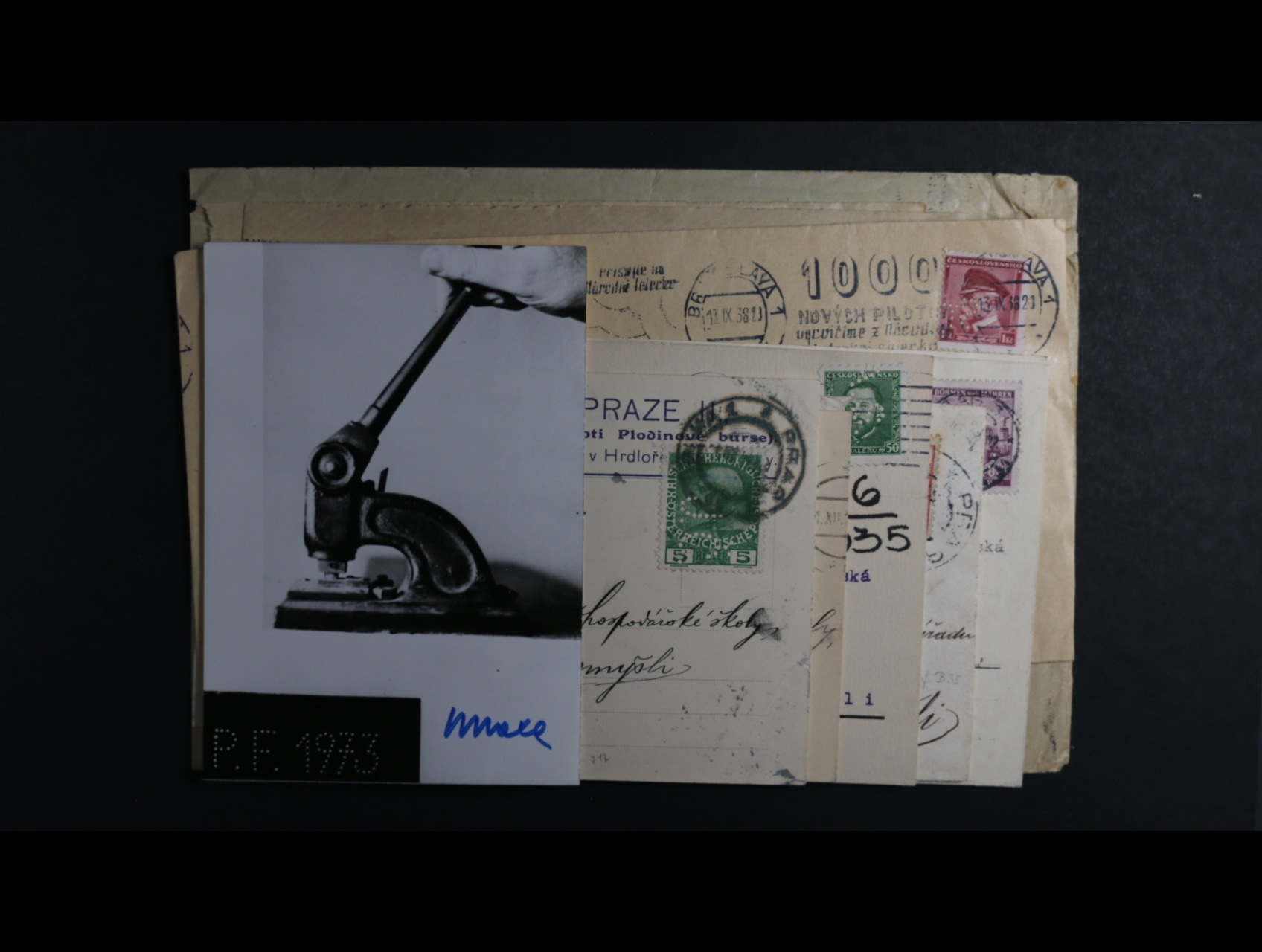 sestava 10 ks předních stran dopisů + devět firemních kompl. celistvostí z let 1906 - 1938 s identifik. perfiny + novoročenka z r. 1973 s podpisem Maxa, zajímavé