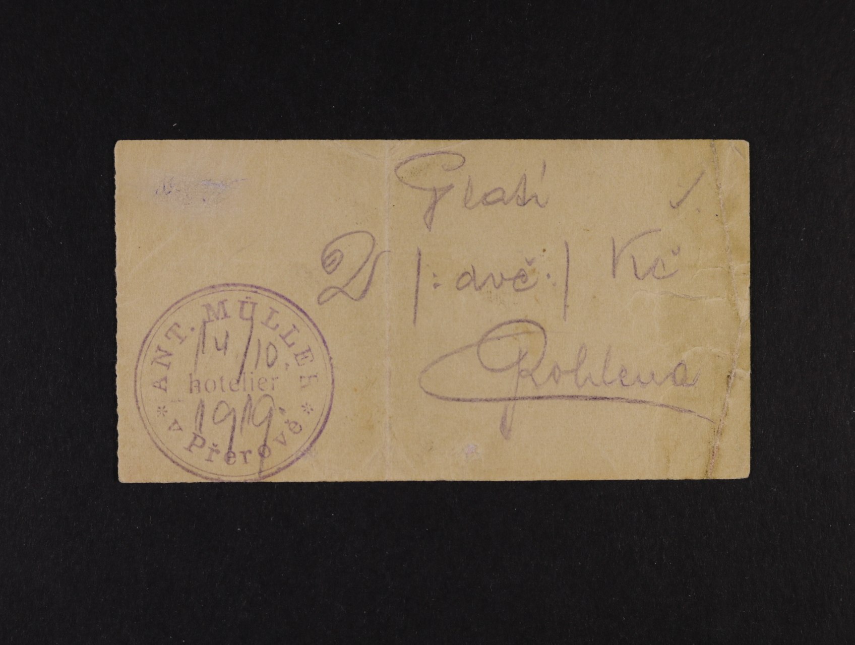 Přerov, 2 Kč 14.10.1919 Ant. Müller, hoteliér, D.H. 170.1.2b