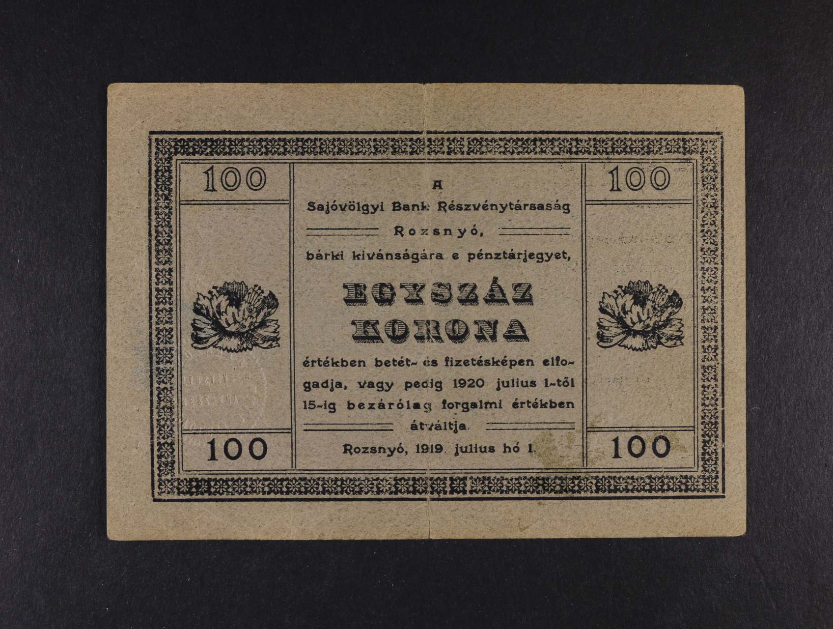 Rozsnyó (Rožňava), 100 K 1.7.1919 sér. 357 Sajóvölgyi Bank Részvénytársaság, D.h. 177.1.11