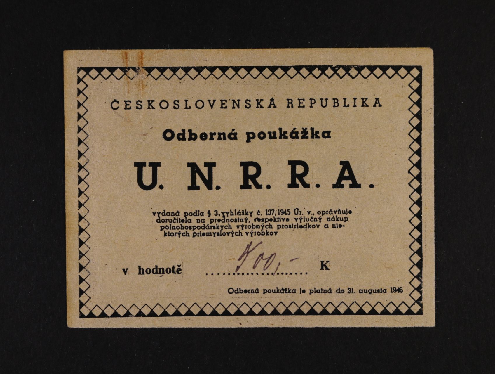 U.N.R.R.A. Odberná poukážka 1945, formulář, dodatečně dopsaná hodnota 500 + raz.