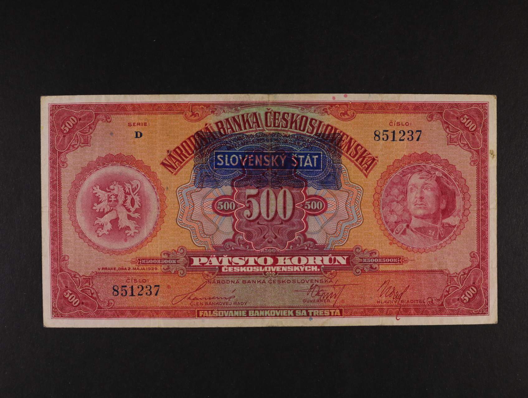 500 Ks 2.5.1929 s přetiskem série D, Ba. 44, Pi. 2a
