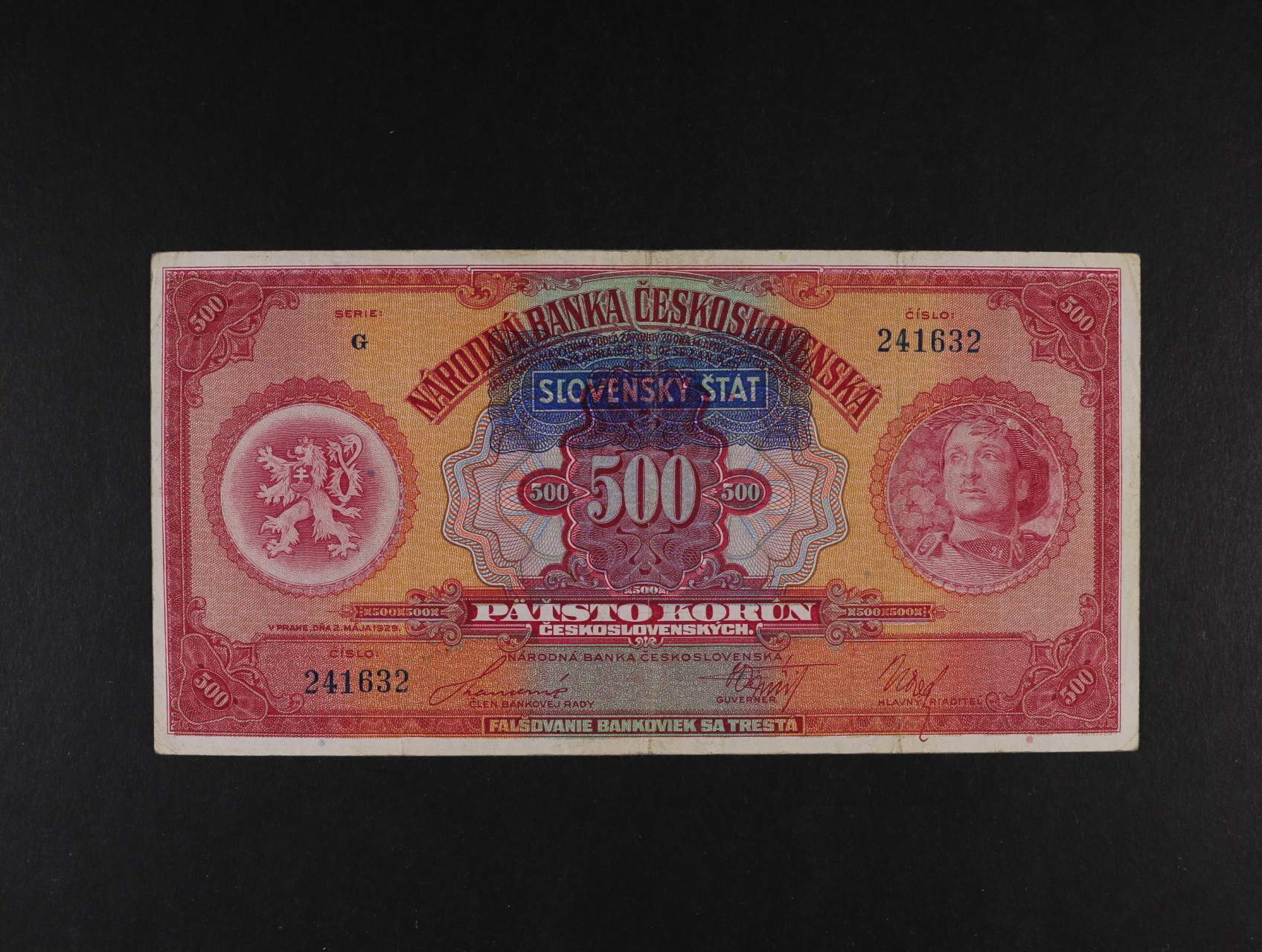 500 Ks 2.5.1929 s přetiskem série G, Ba. 44, Pi. 2a