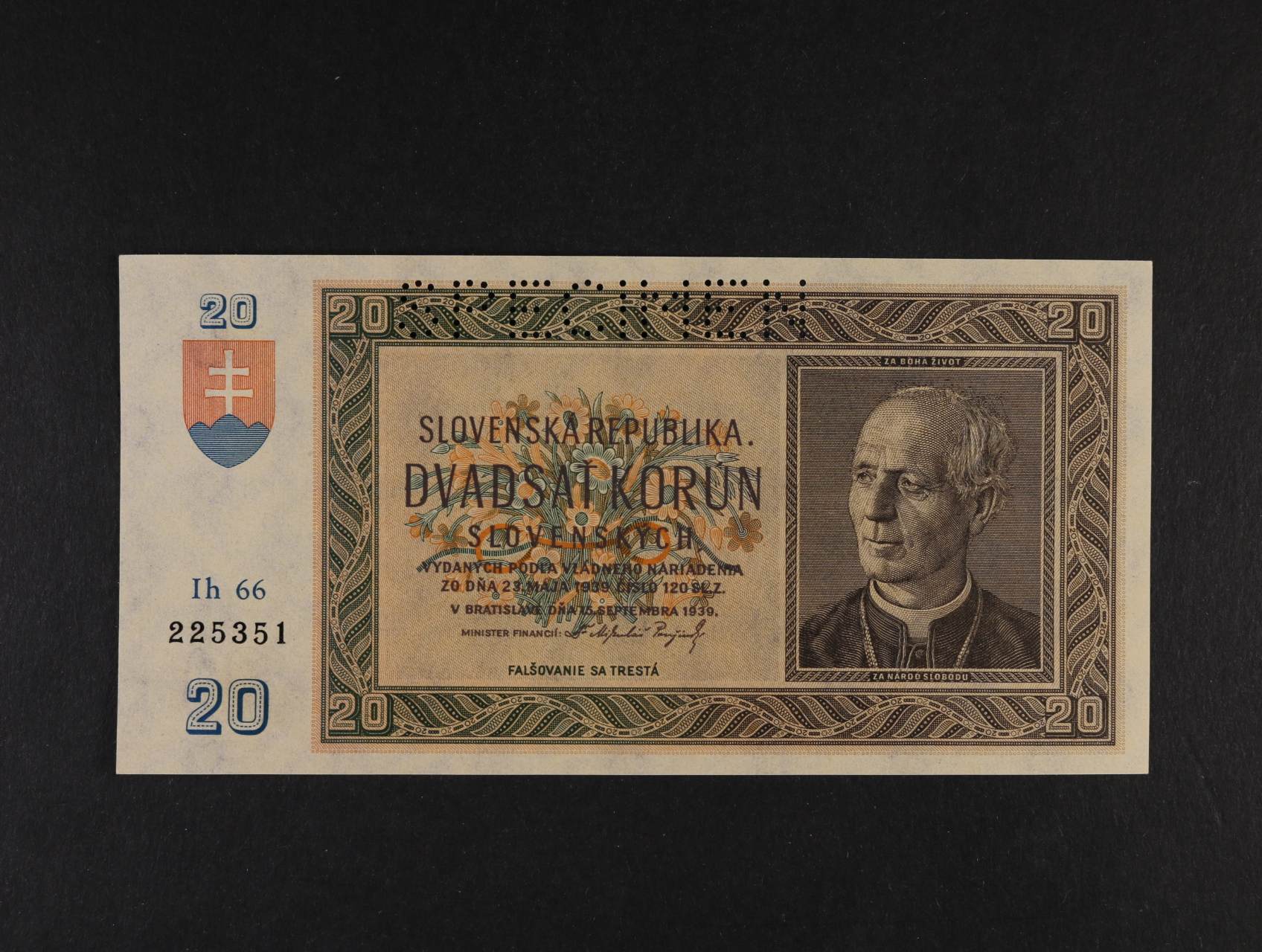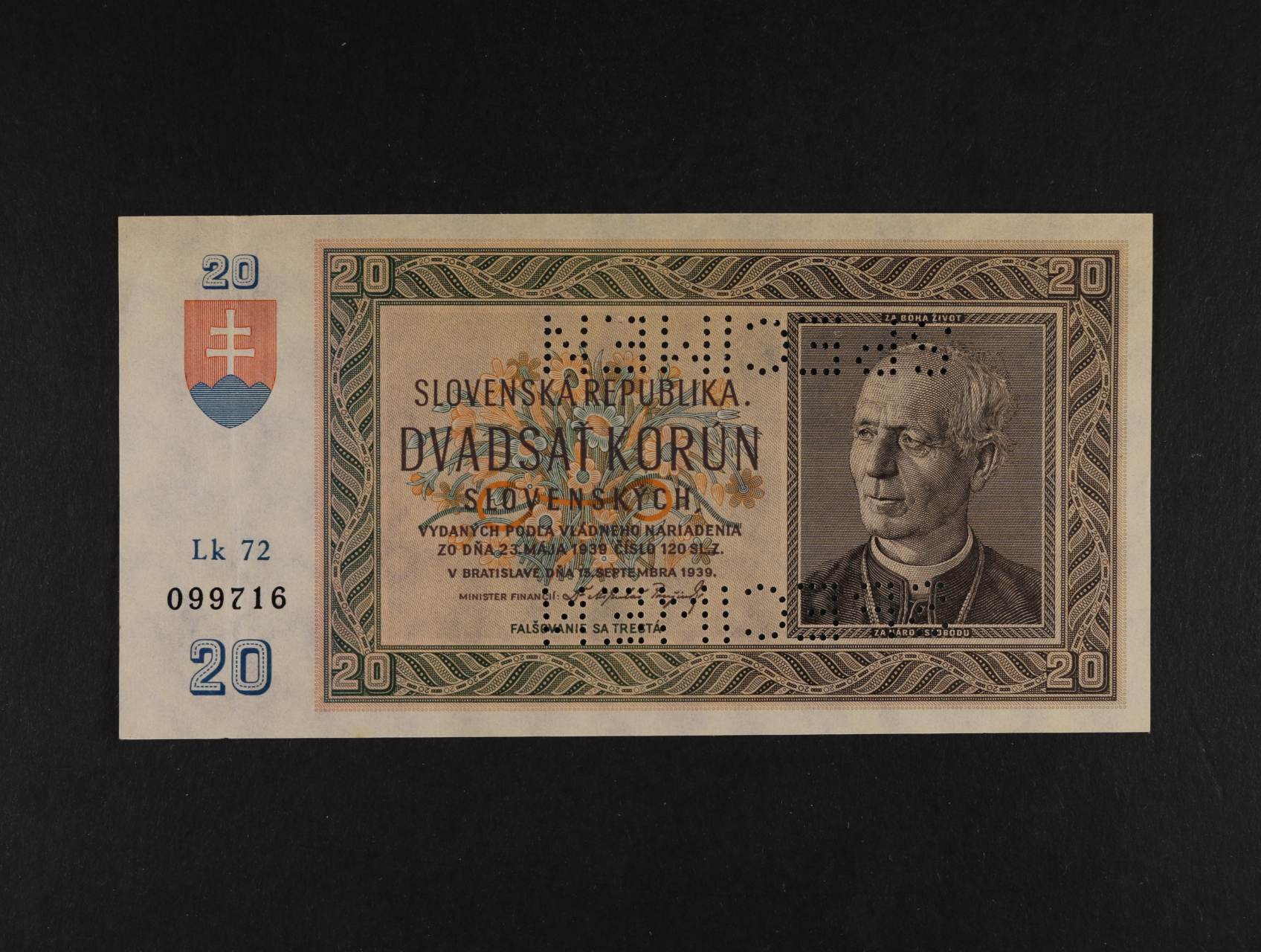 20 Ks 15.9.1939 série Lk 72 bankovní vzor s 2x perf. SPECIMEN, Ba. 47b, Kar. 43b, Pi. 5s