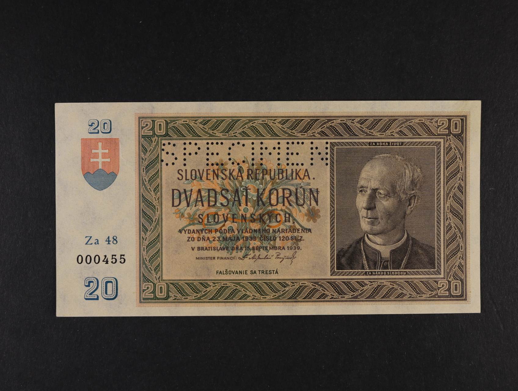 20 Ks 15.9.1939 série Za 48 bankovní vzor s perf. SPECIMEN, Ba. 47b, Kar. 43a, Pi. 5s