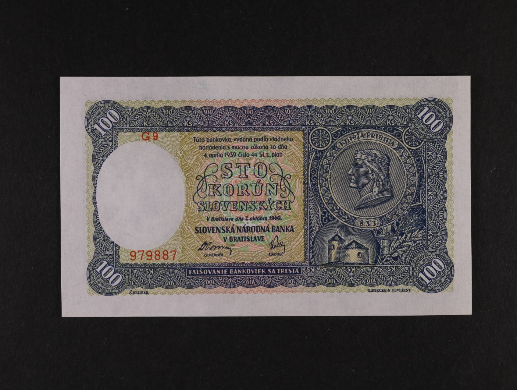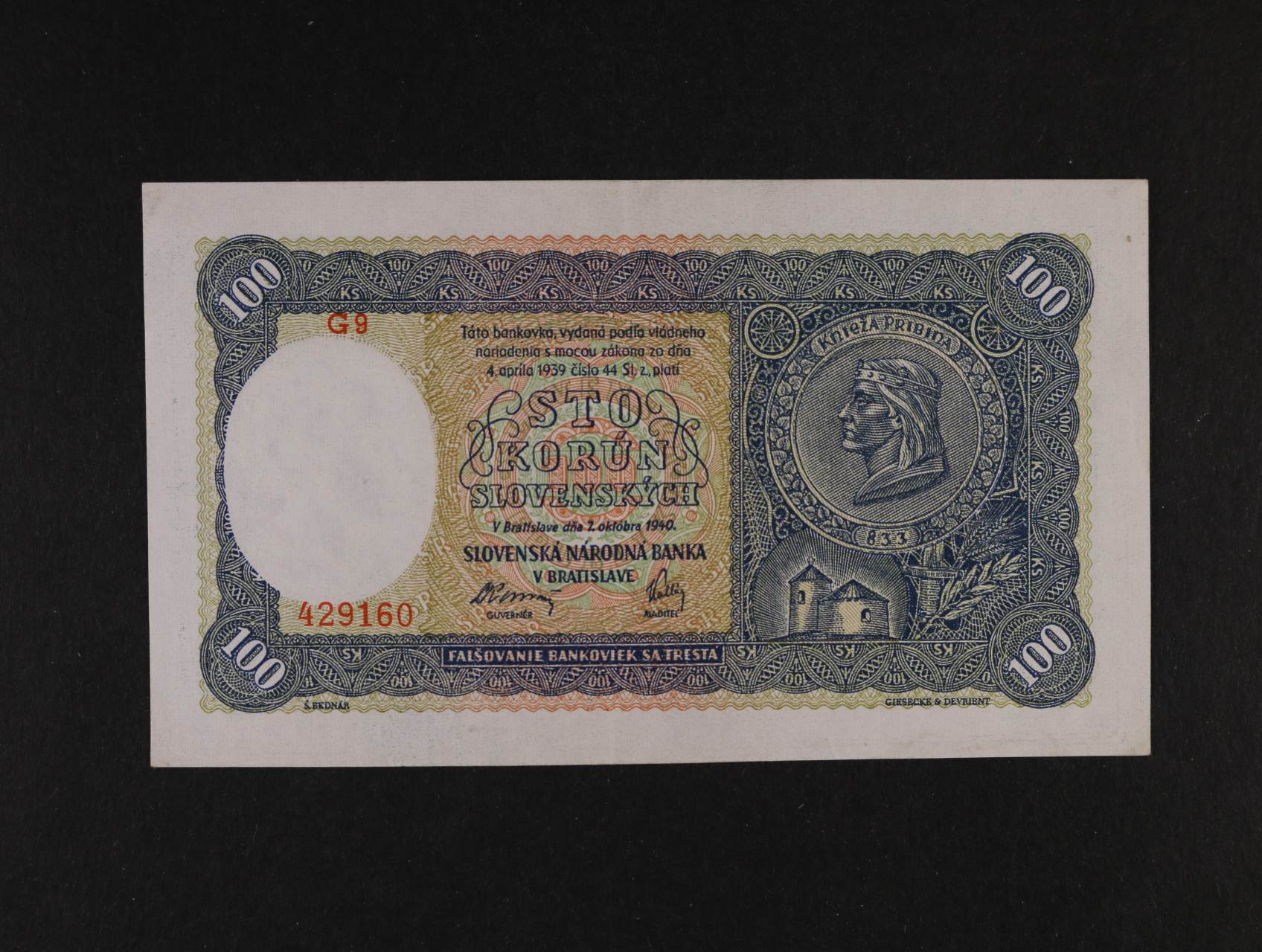100 Ks 7.10.1940 série G 9, I.vydání, Ba. 48a, Pi. 10a
