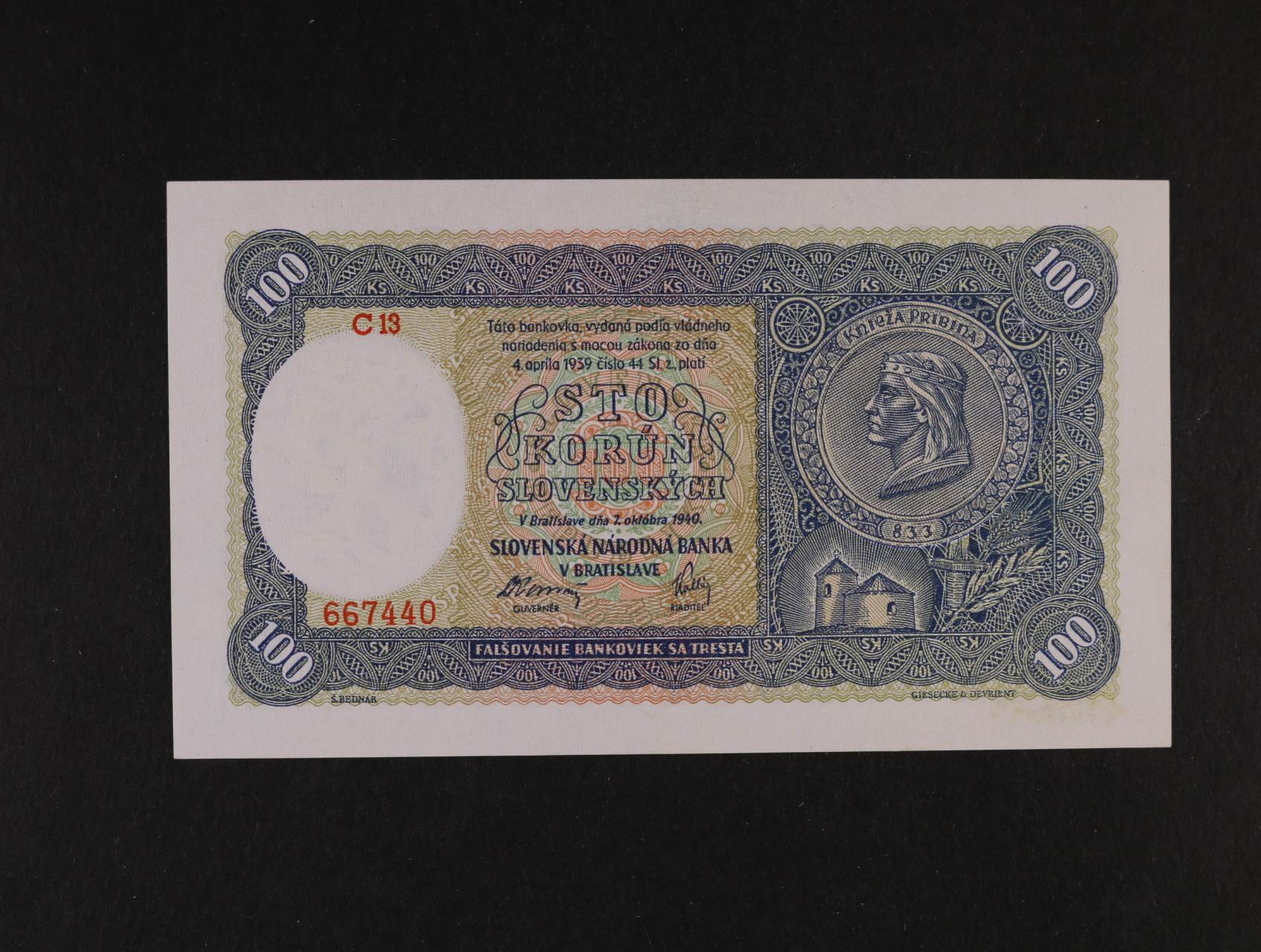 100 Ks 7.10.1940 série C 13, I.vydání, Ba. 48b, Pi. 10a