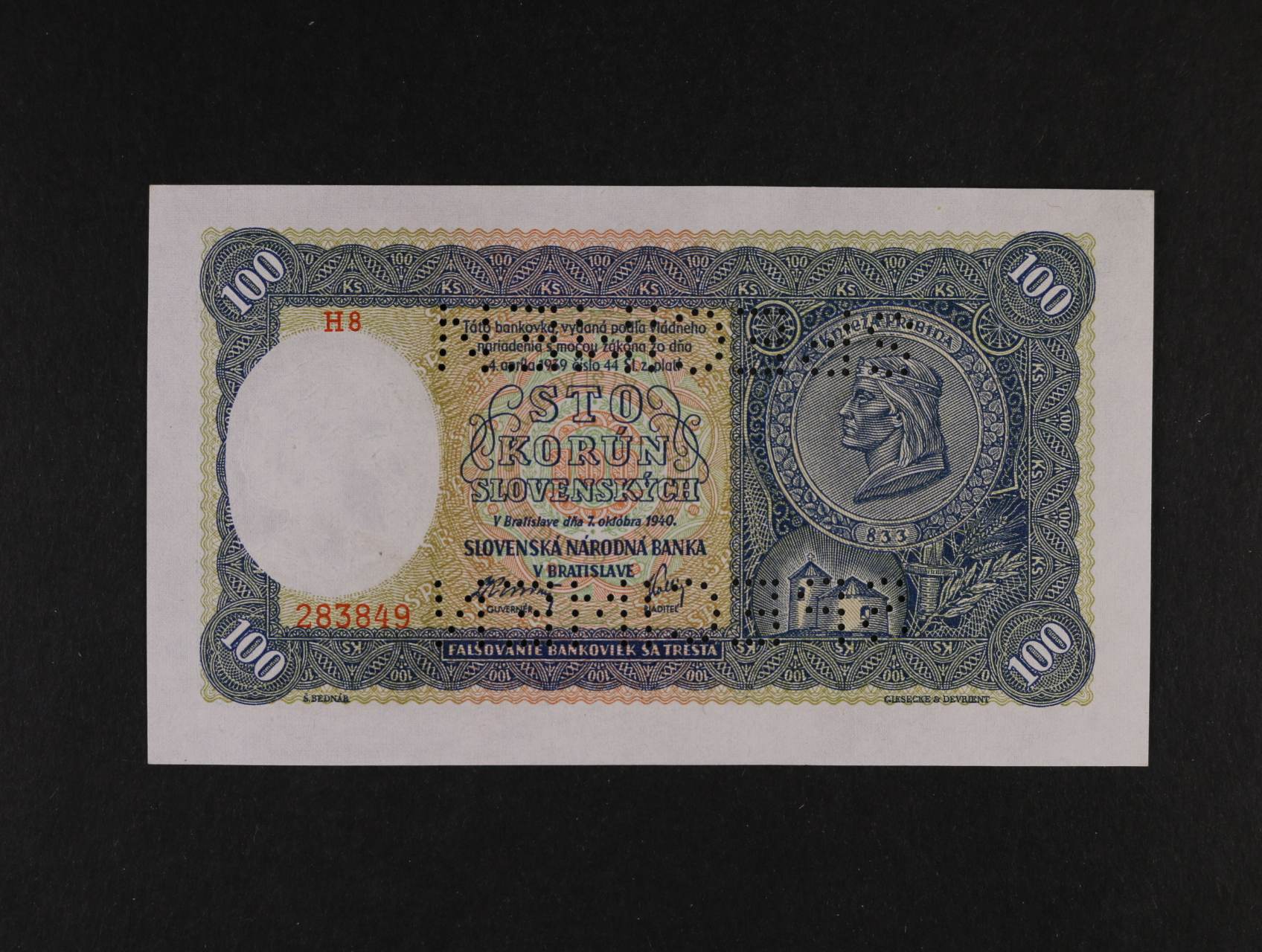 100 Ks 7.10.1940 série H 8, I.vydání, bankovní vzor s 2x perf. SPECIMEN, Ba. 48a, Kar. 44b, Pi. 10s