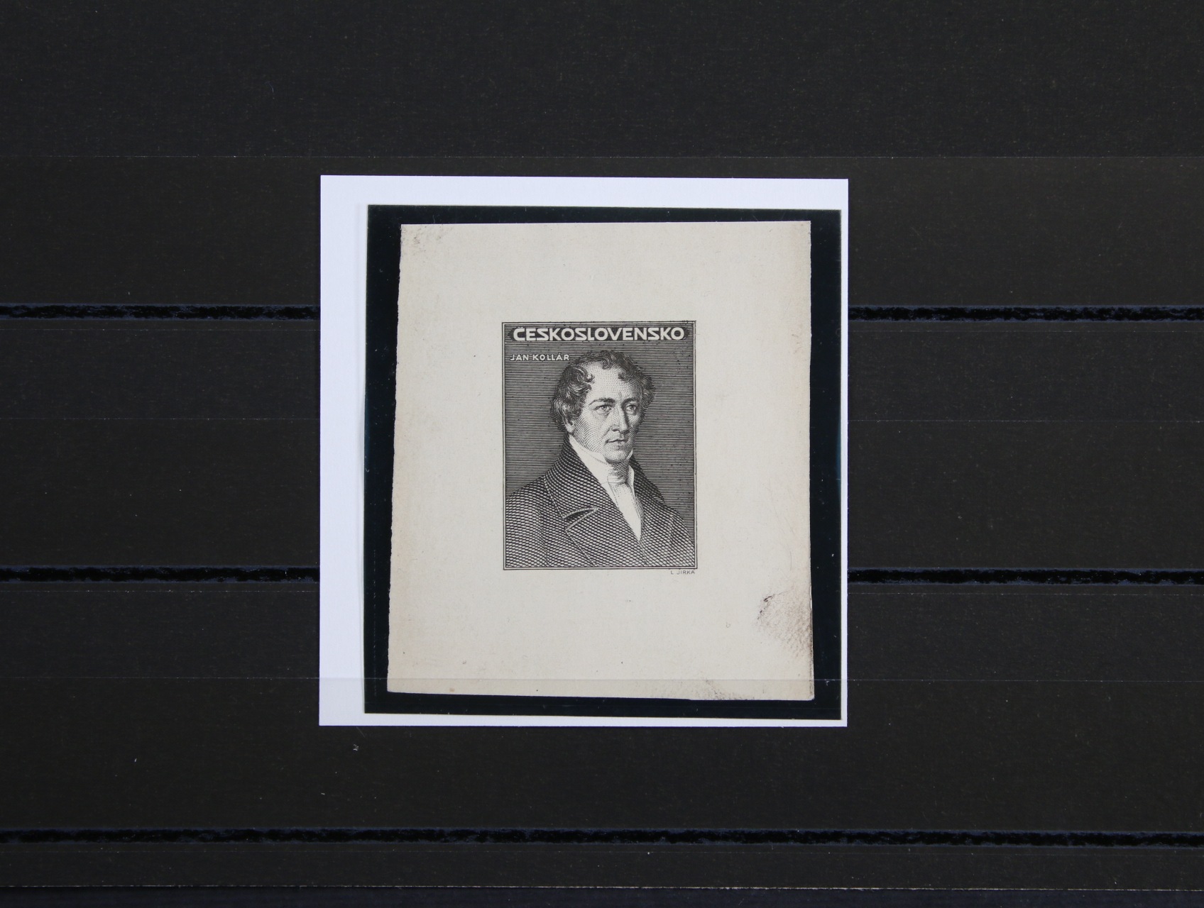 773 Orig. otisk rytiny nepřijatého studijního návrhu ke zn. č. 627-8, Ján Kollár, bez hodnotového označení v černé barvě na kousku kříd. papíru bez lepu, zk. Karásek 1000
