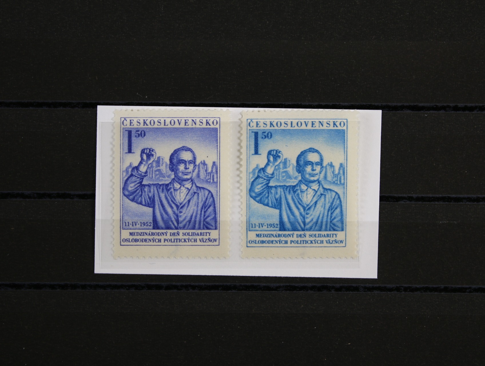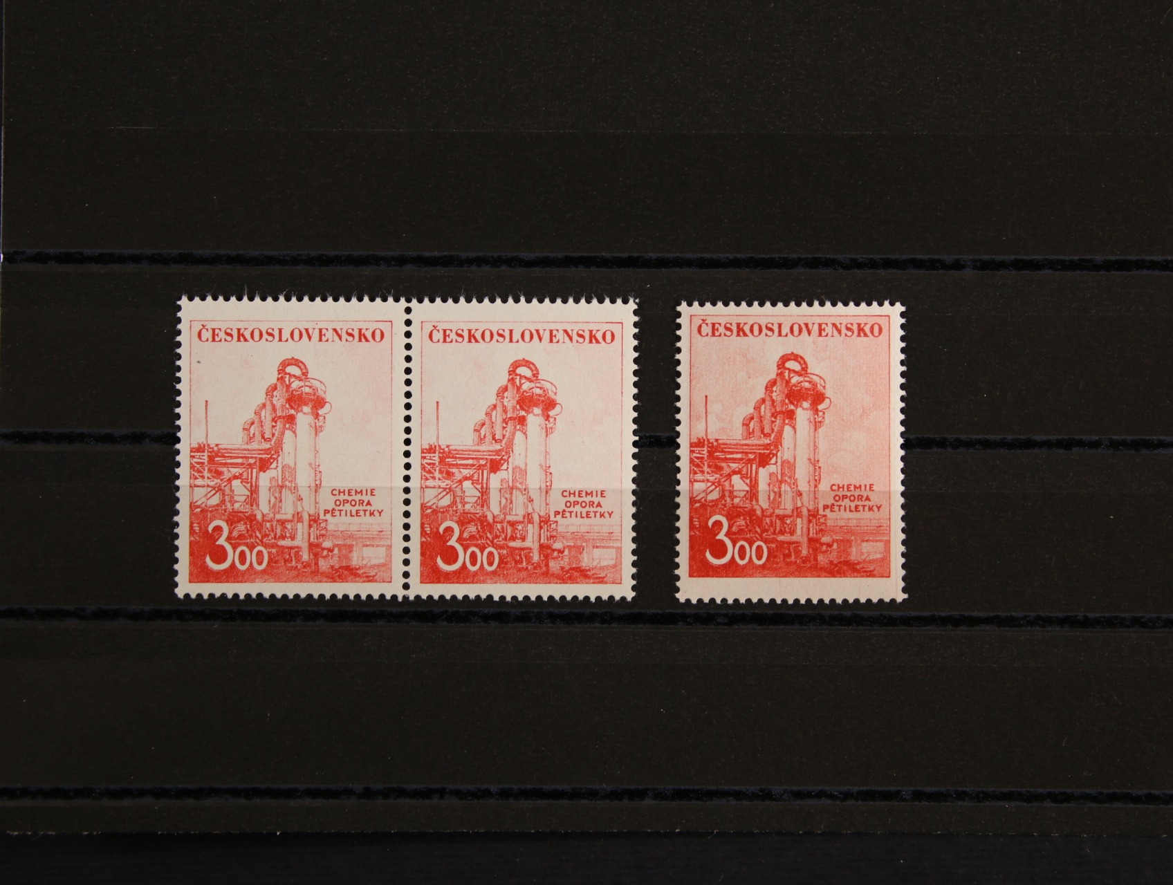 774 zn. č. 635 ve dvoupásce se silným nedotiskem červené barvy, především v pozadí, přiložena běžná zn. na porovnání 300