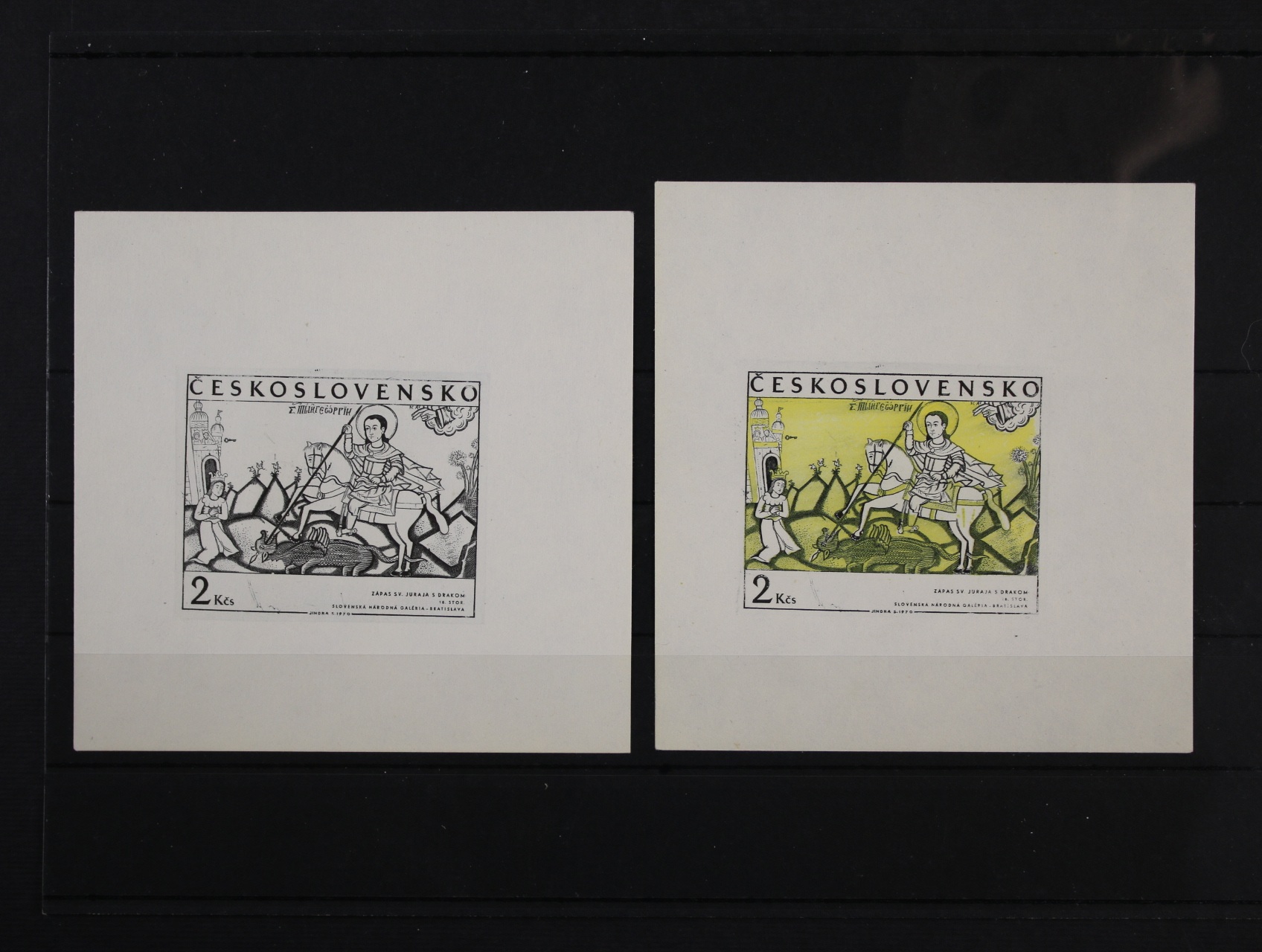 Otisk orig. rytiny zn. č. 1866, sv. Jiří, v černé barvě na kousku bílého papíru + soutisk žluté a černé barvy