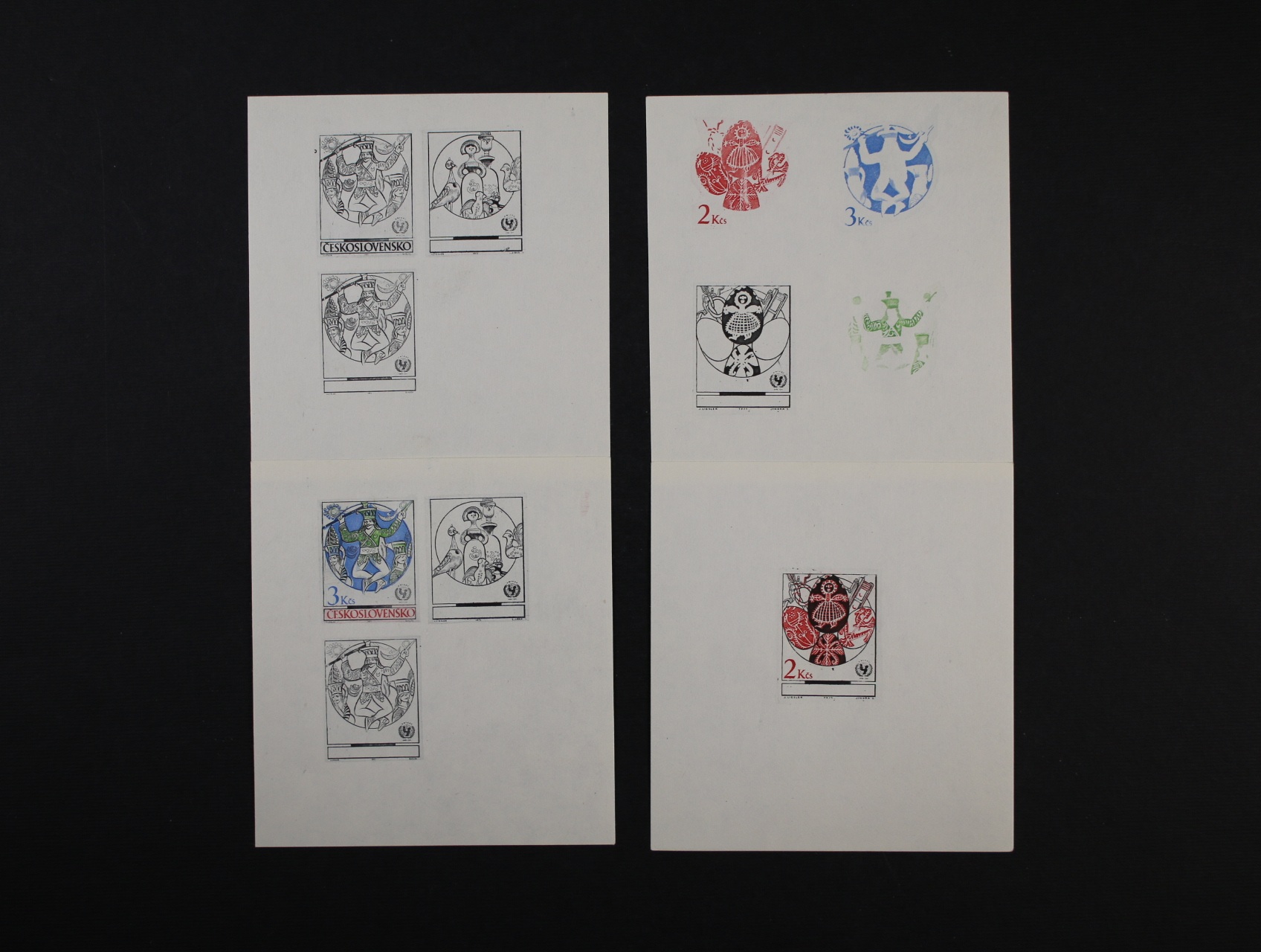 Otisky zn. č. 1927, 1931 a 1932, UNICEF, na kouscích bílého papíru v černé barvě, fázové a kompletní tisky, zajímavá sestava