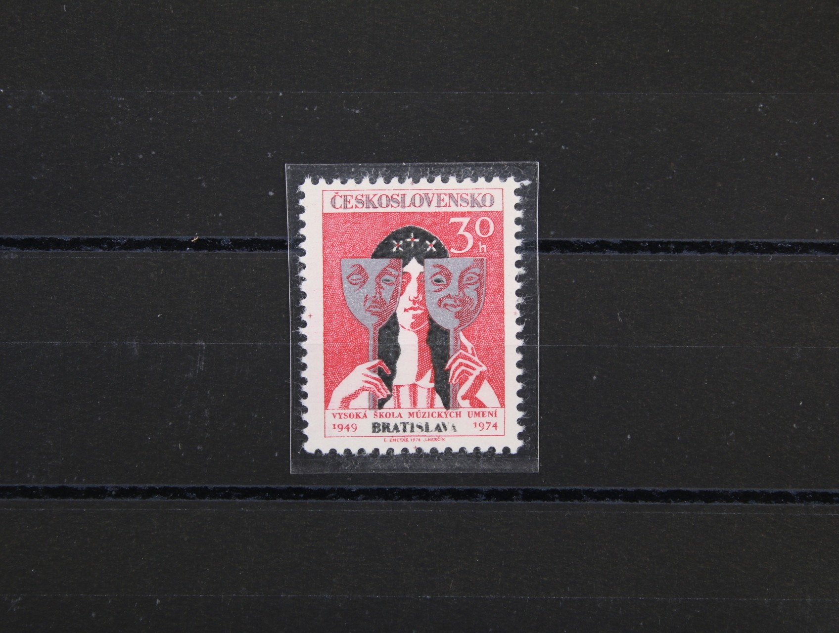 Otisk orig. definitivní rytiny zn. č. 1950, V. Fiala, v odlišných barvách na kousku karton. papíru bez lepu