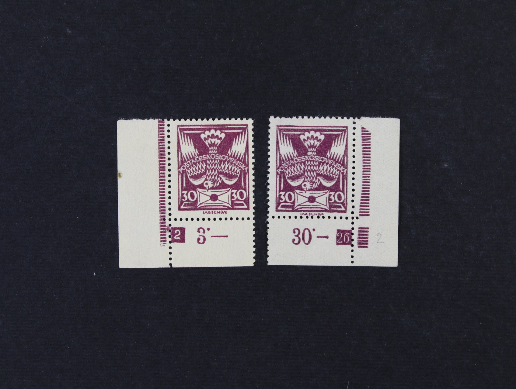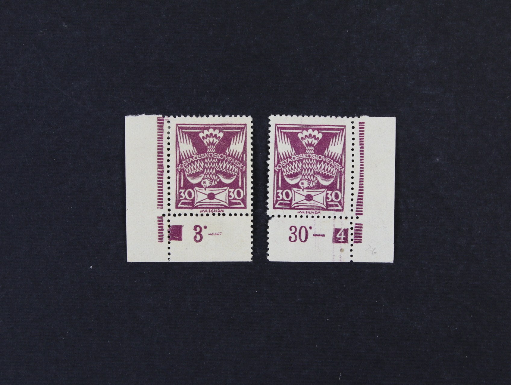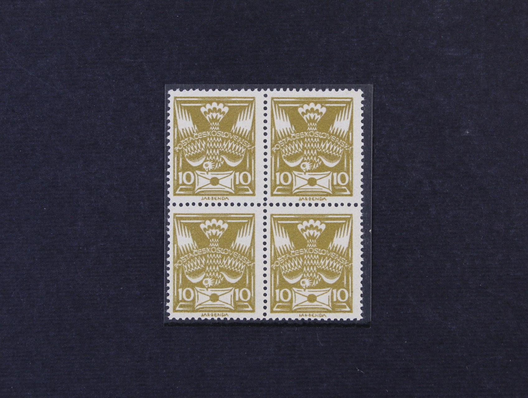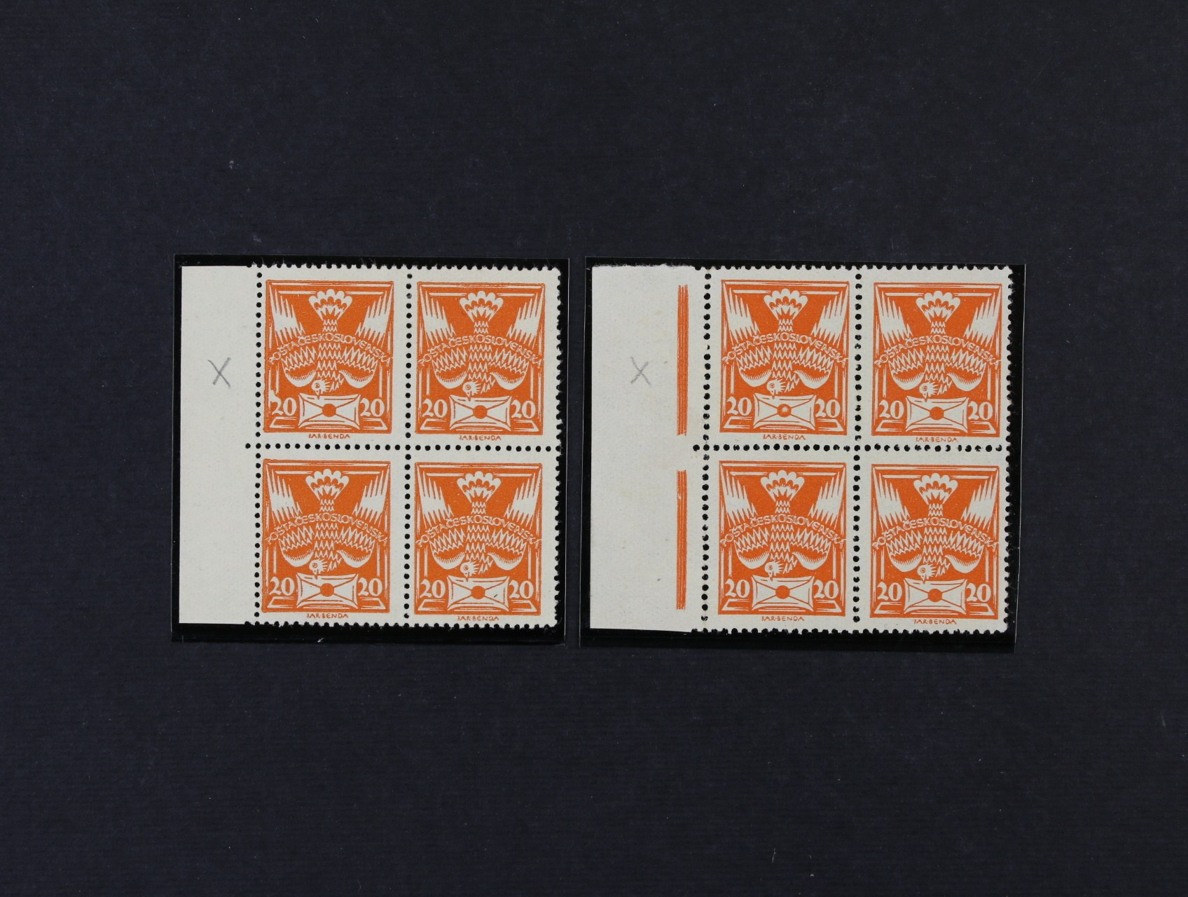 zn. č. 148 krajové čtyřbloky, I. a II. typ, nahodilé vady - bílá skvrna nad hodnotou na I. typu a bílá skvrna v psaníčku na II. typu