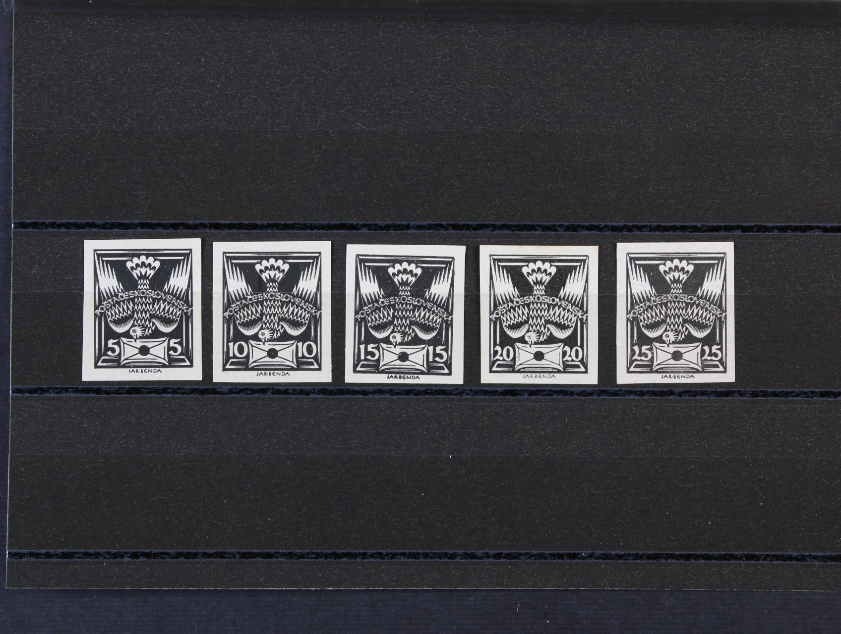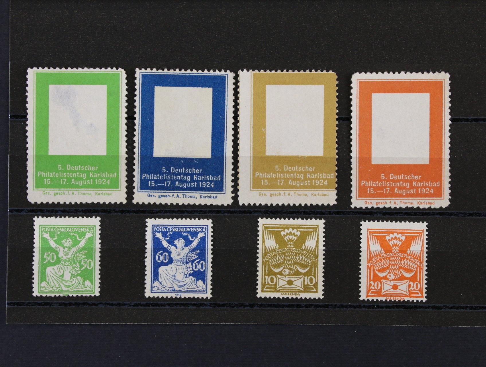 Propagační nálepky k 5. sjezdu něm. filatelistů v Karlových Varech 15.-17. srpna 1924, přiloženy zn. emise Holubice a OR které se na nálepky vlepovaly, nálepky mají uprostřed svěliny po sundání z celistvosti nebo nálepky
