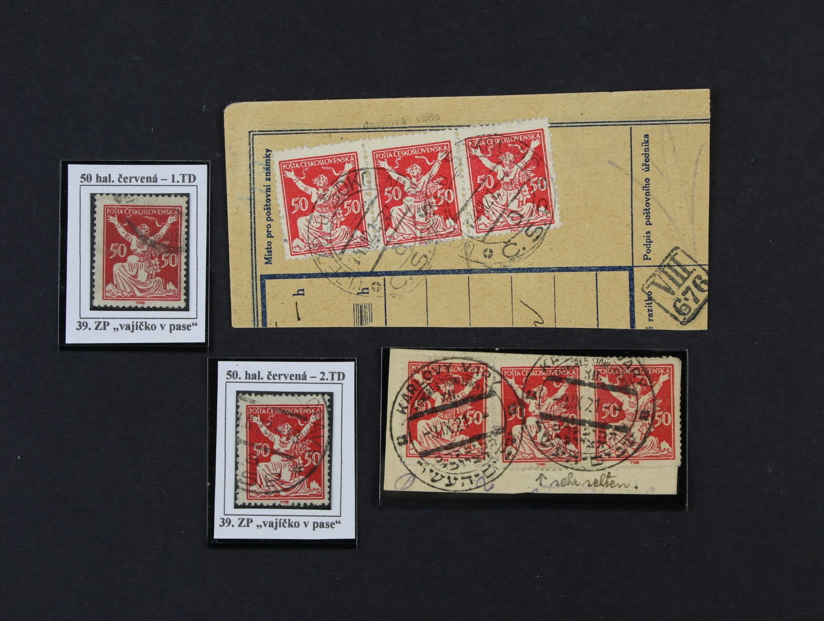 419 zn. č. 155 s DV 1 vajíčko v pase na ZP 39, TD 1 a dtto TD 2 + třípáska s DV 1 na výstřižku a třípáska s DV 1 na ústřižku pošt. průvodky, 500