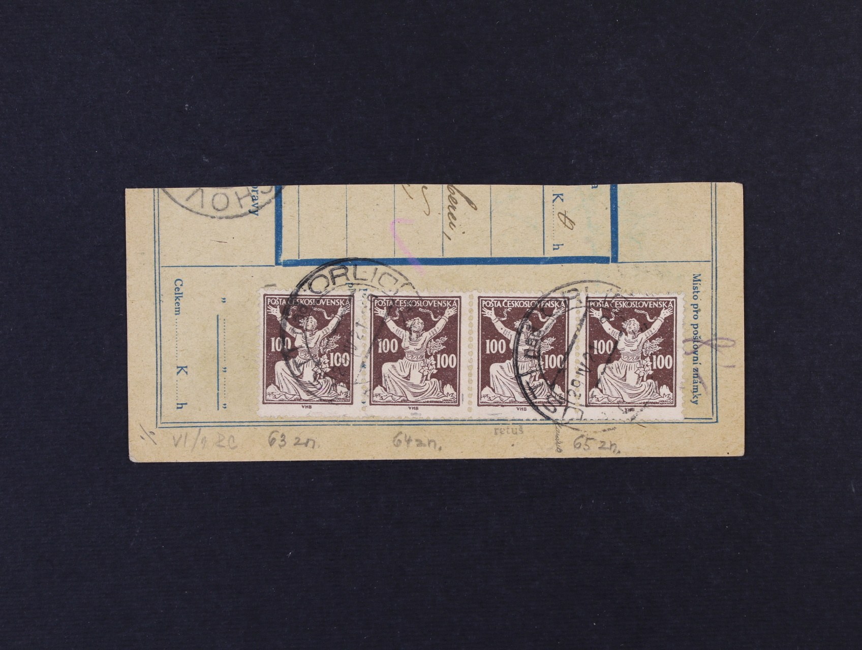 zn. č. 158 ve vodorovné čtyřpásce na líci i rubu pošt. průvodky s retuší VI/1 RC spodní linky na ZP 65, pod. raz. ÚSTÍ NAD ORLICÍ 29.4.21, velmi zajímavé, vzácné